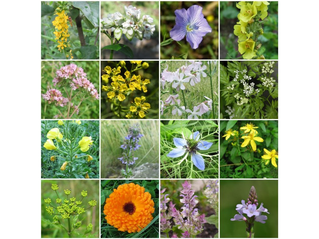 - Složení: černucha damašská (Nigella damascena), divizna velkokvětá (Verbascum densiflorum), dobromysl obecná (Origanum vulgare), kerblík třebule (Anthriscus cereifolium), kopr vonný (Anethum graveolens), len setý (Linum usitatissimum), měsíček lékařský (Calendula officinalis), mydlice lékařská (Saponaria officinalis), pohanka obecná (Fagopyrum esculentum), pupalka dvouletá (Oenothera biennis), routa vonná (Ruta graveolens), řepík lékařský (Agrimonia eupatoria), sporýš lékařský (Verbena officinalis), šalvěj muškátová (Salvia sclarea), šalvěj přeslenitá (S. verticillata), třezalka tečkovaná (Hypericum perforatum)