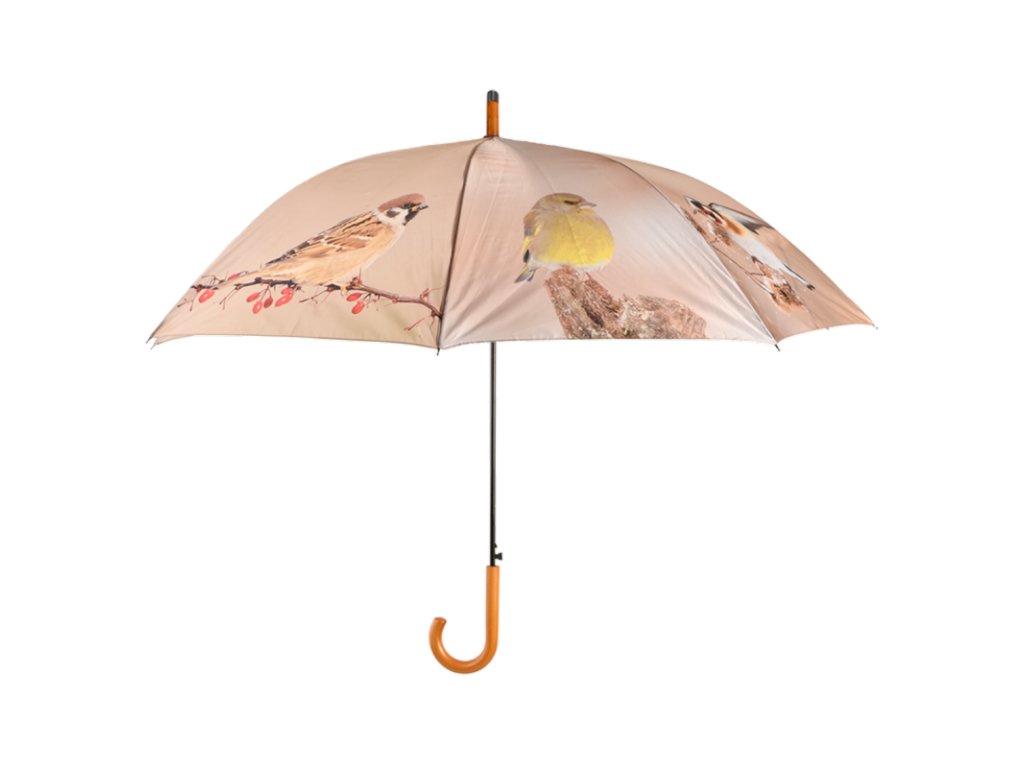 Deštník je potištěný fotkami ptáků, kteří přezimují u nás v Evropě, na deštníku najdete kosa černého, sýkoru modřinku, pěnkavu obecnou, stehlíka, zvonka zeleného, vrabce polního, červenku a sýkoru koňadru. Skvělý dárek pro milovníky našich opeřených sousedů.