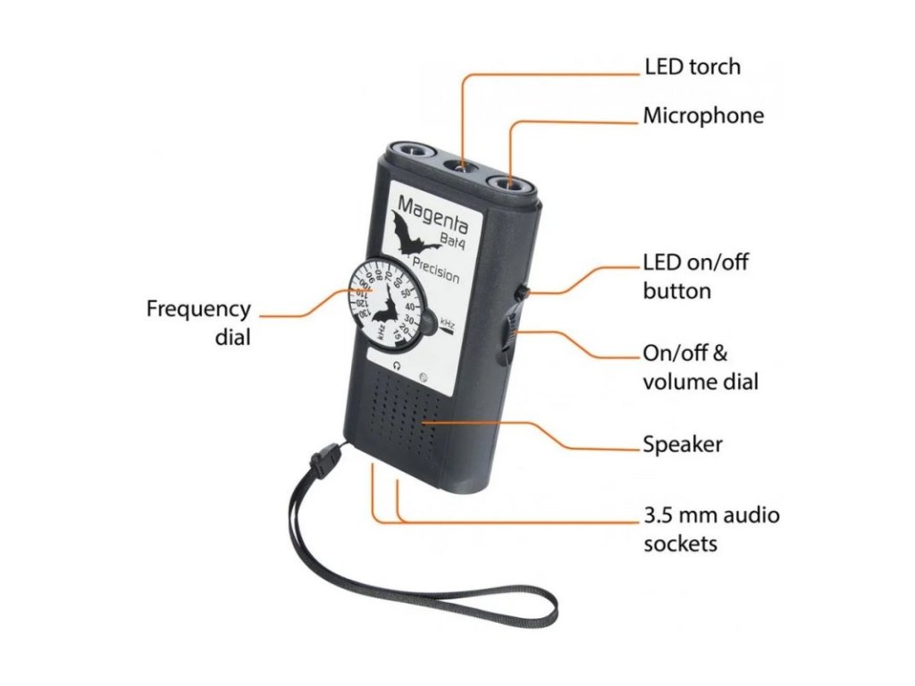 - Detektor zachycuje vysokofrekvenční zvuky v rozsahu frekvencí 15 až 130 kHz, což je rozsah, který jednotlivé druhy netopýrů využívají. Zvuky jsou slyšet přes vestavěný reproduktor.