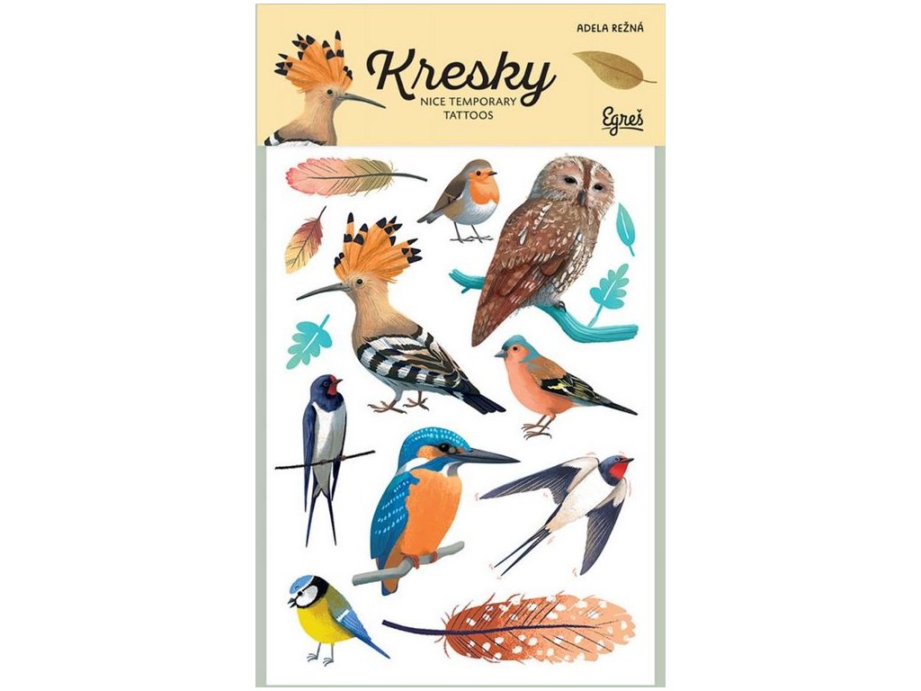 Kresky - dočasné tetovačky, vymyšlené a vytvořené na Slovensku. Krásní pestrobarevní ptáčci, které nakreslila Adela Režná.