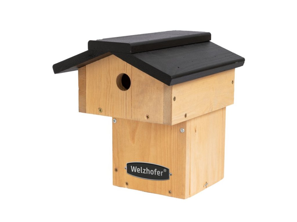 Ptačí budka má vnější rozměry: šířka 22 cm x výška: 27,5 cm x hloubka 26,5 cm, vnitřní rozměry hnízdního prostoru jsou 12 x 12 cm.