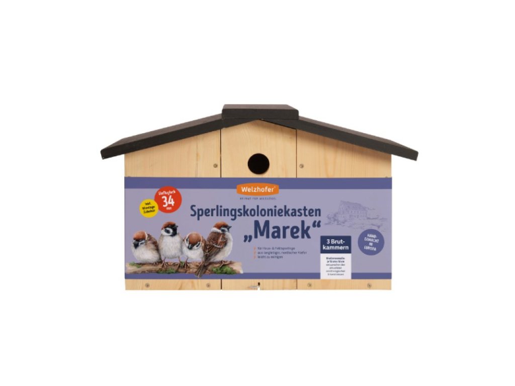 Vrabci jsou extrémně společenští ptáci, žijí spolu ve skupinkách po celý rok. Vrabci rádi hnízdí koloniálně, tedy blízko sebe, do této budky se vejdou až tři rodinky vrabců nebo jiných ptáků. Každý páreček má vlastní vchod do budky a hnízdní prostor. Vhodných míst k hnízdění v naší krajině a městech výrazně ubylo, proto je každá ptačí budka velmi vítaná. V zimě může budka ptákům sloužit také jako úkryt při nepříznivém počasí nebo pro přespání. Budku doporučujeme jednou za rok (nejlépe po skončení hnízdní sezóny) vyčistit.