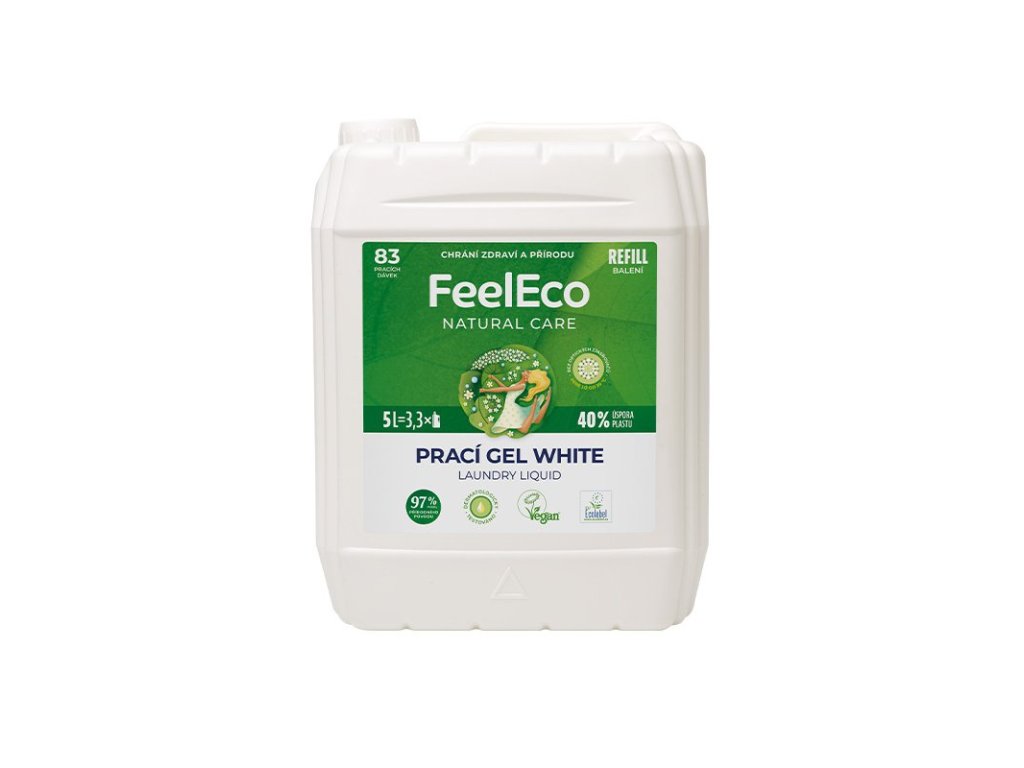 Tekutý koncentrovaný prací prostředek určený na praní bílého prádla při nízkých teplotách. Pere výborně už při teplotě 30 °C. Nedráždí a nevysušuje kůži, šetří přírodu i vaši čističku odpadních vod. Pro obtížně odstranitelné skvrny doporučujeme použít Feel Eco odstraňovač skvrn.