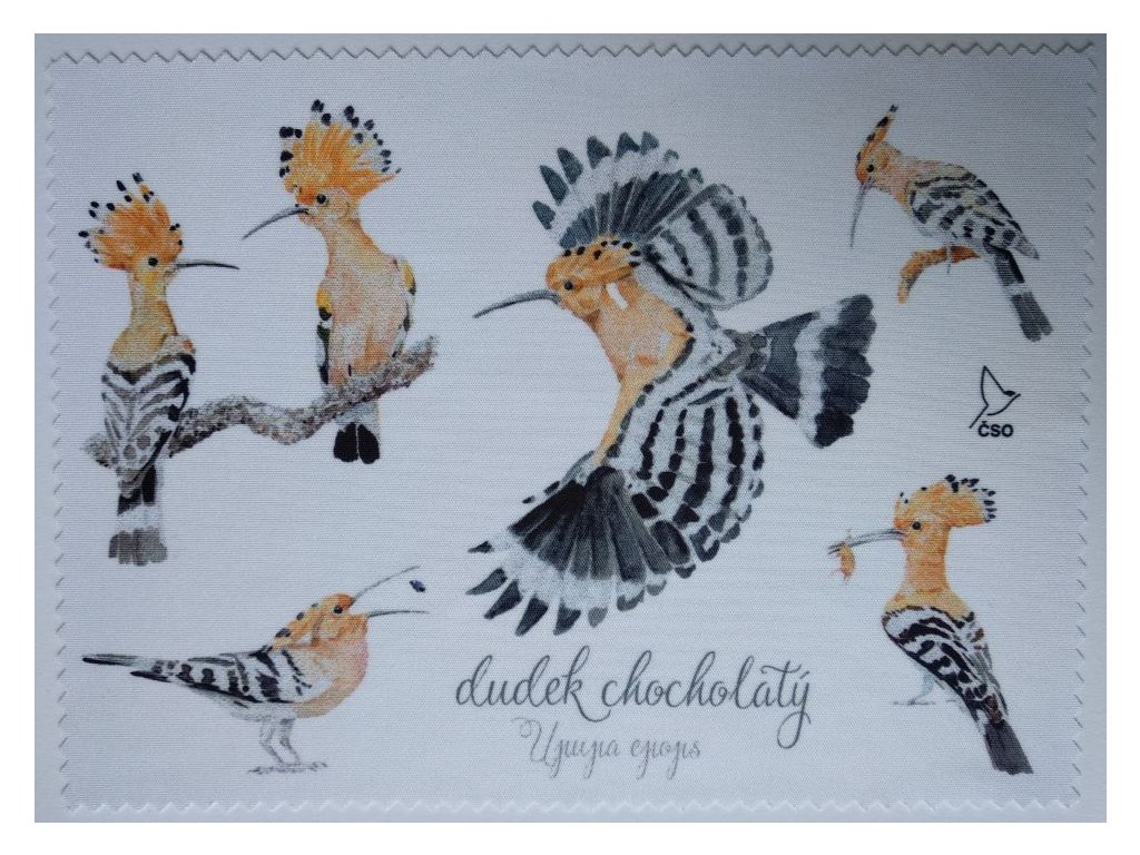 Utěrka z mikrovlákna na dalekohled, brýle či monitor ze speciální testované látky, která nepoškrábe ani jemnou optiku a přesto očistí i nejmenší nečistoty. S motivem dudka chocholatého. Autorem předlohy je Jan Hošek.