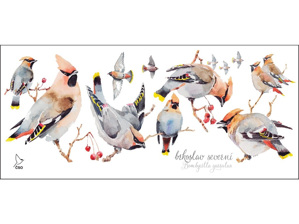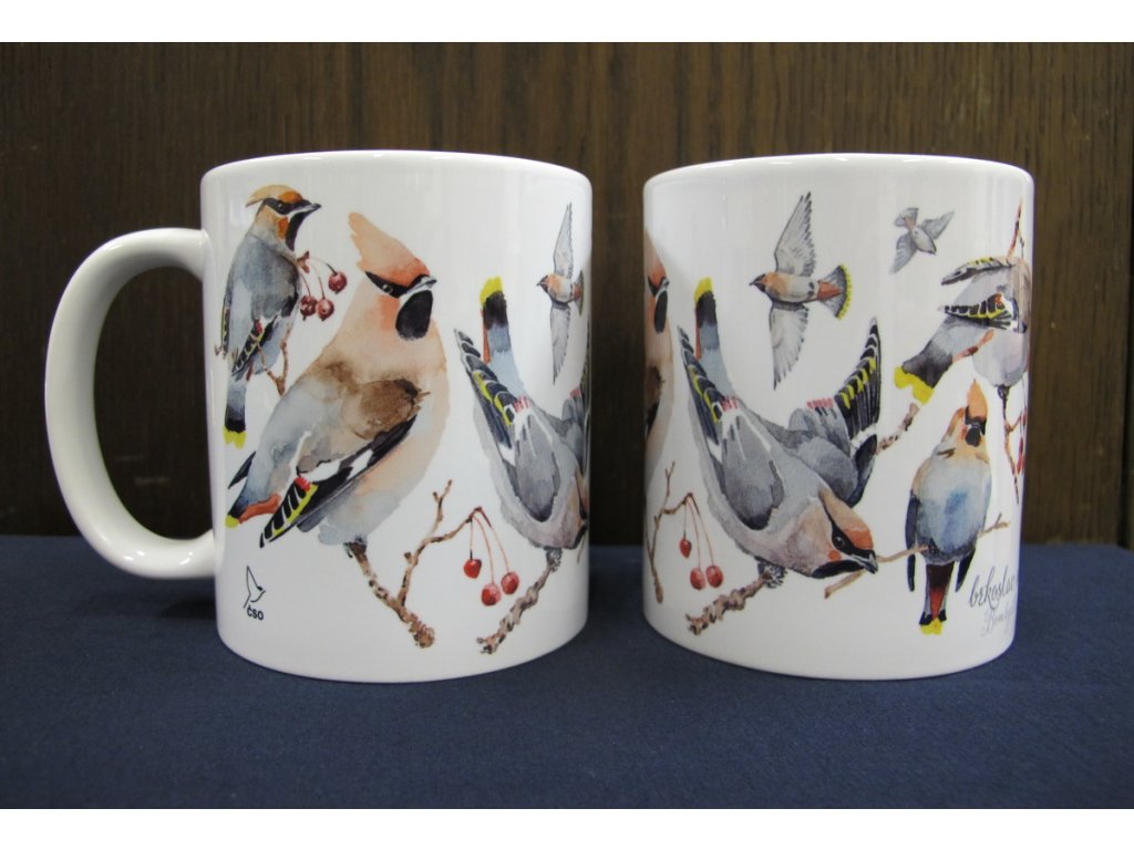 Bílý keramický hrnek se sublimačním potiskem s originálním malovaným motivem brkoslavů. Autor návrhu: Jan Hošek