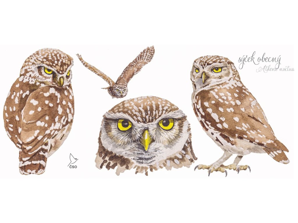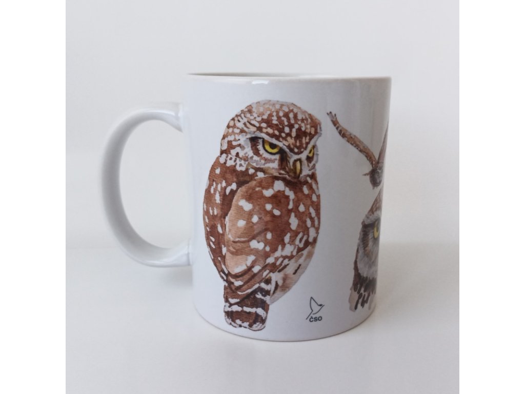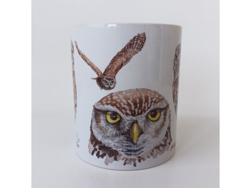 Bílý keramický hrnek se sublimačním potiskem s originálním malovaným motivem sýčků. Autor návrhu: Jan Hošek
