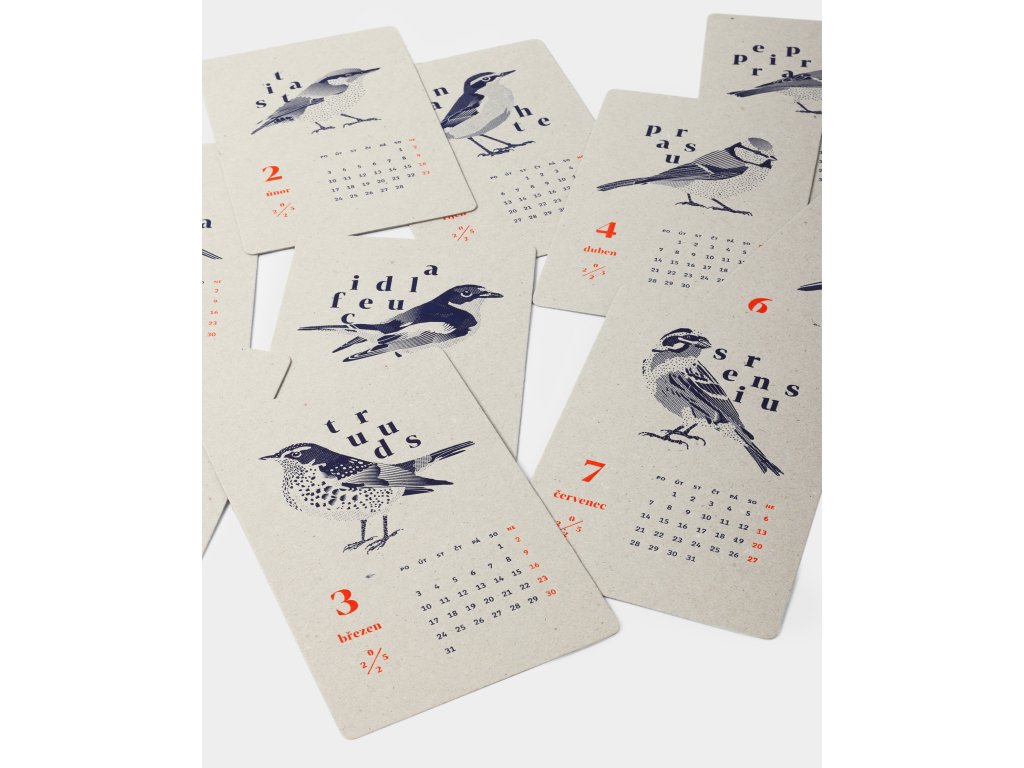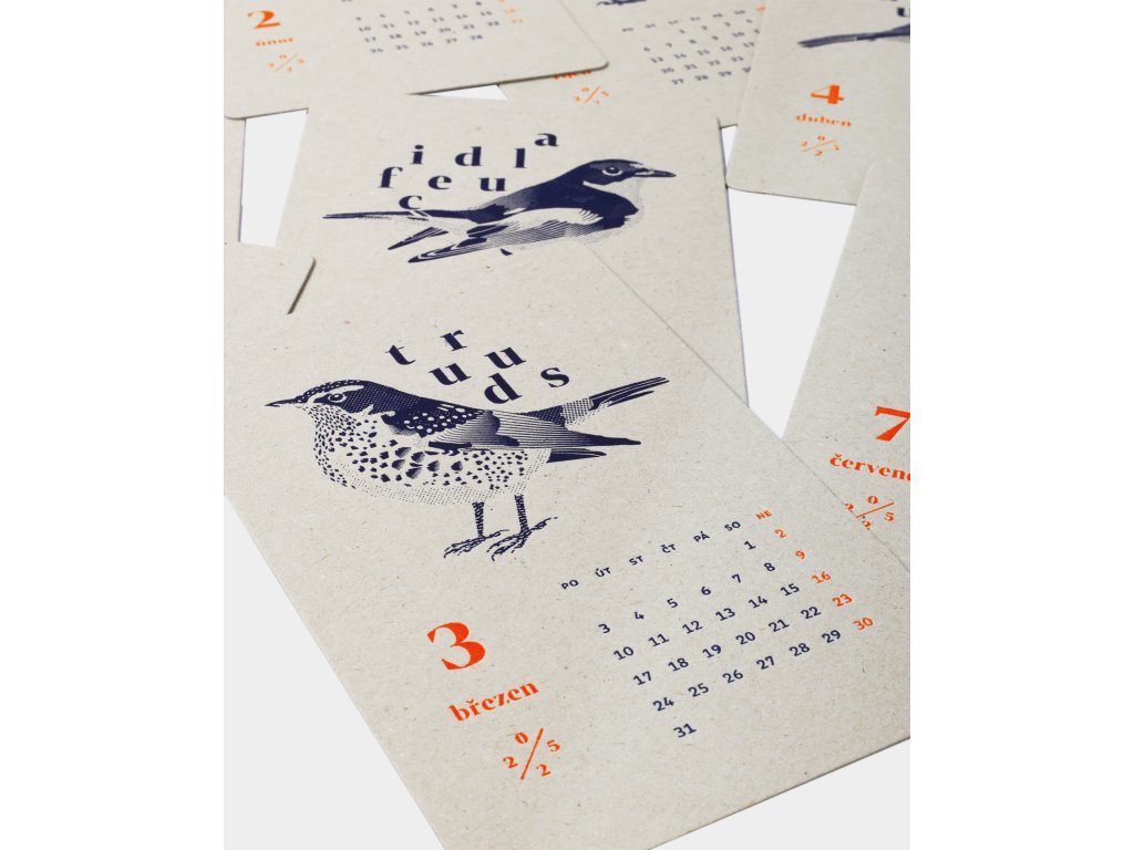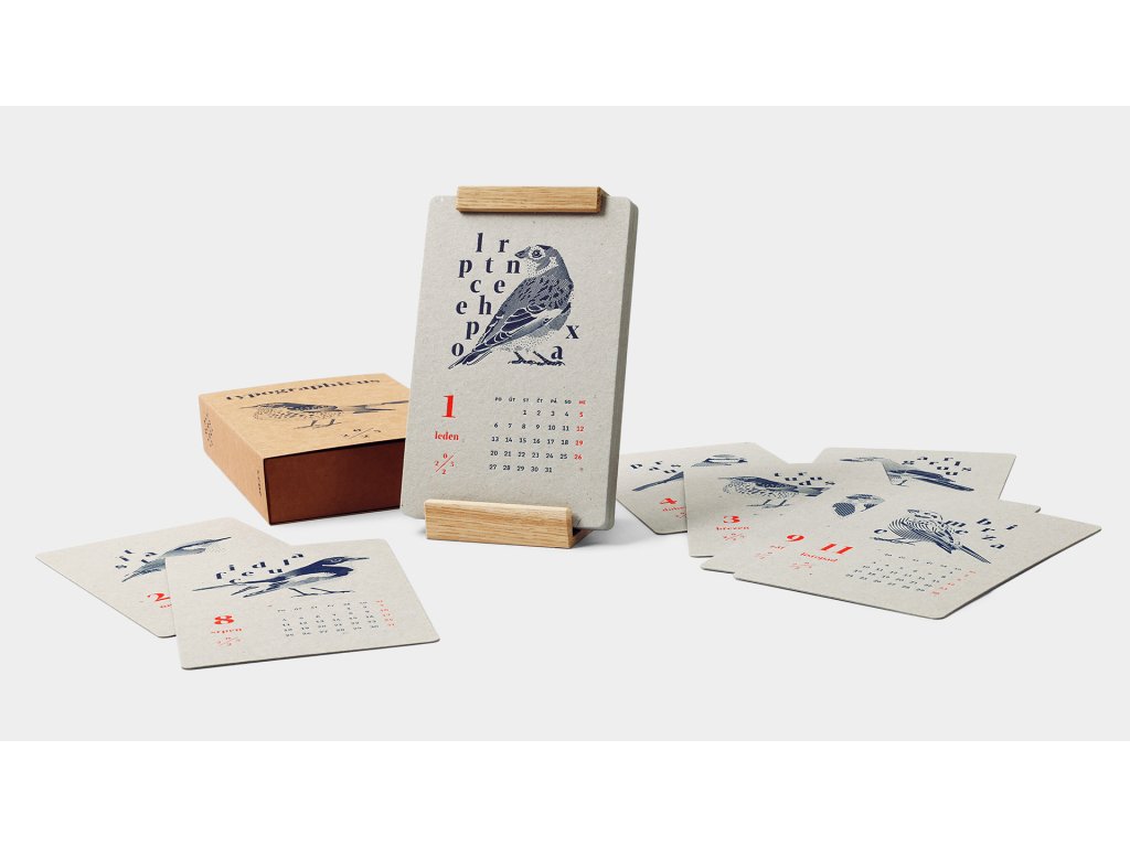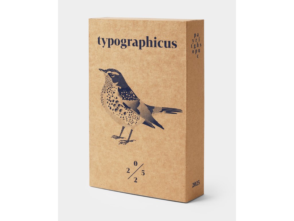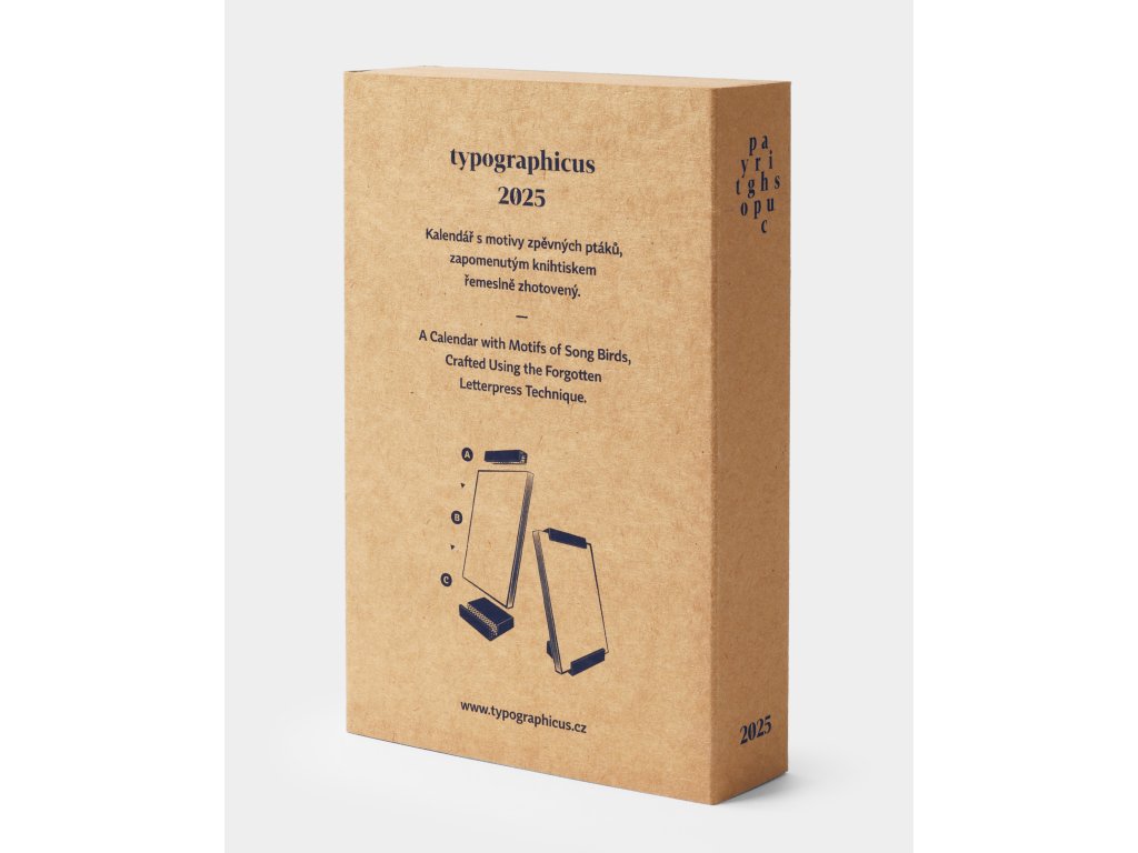 Tradičně netradiční kalendář typographicus 2025 opět přináší motivy dvanácti českých pěvců. Jednotlivé karty byly vytištěny klasickým knihtiskem kovovou matricí a jsou doplněny minimalistickým dubovým stojánkem. Na kartách najdete i typografickou hříčku z latinského jména příslušného opeřence. Vše je zabaleno v dárkové krabičce z kraftového kartonu.