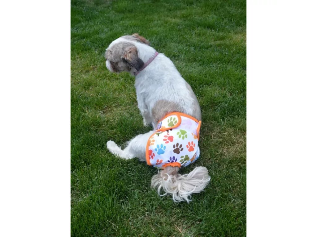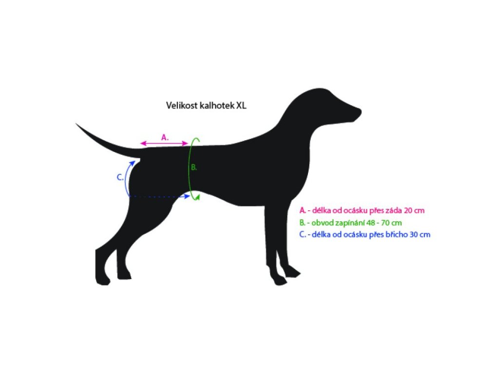 Flexibilní gumičky umožní zvětšit délku kalhotek, aniž by docházelo k jakémukoliv omezení pejska. Díky praktickému suchému zipu lze pohodlně regulovat v pase, Samozřejmostí kalhotek je praktický otvor na ocásek.