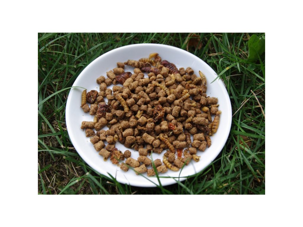 - Složení: drůbeží tuk (6,4%), muší larvy (10%), larvy bource morušového (5%), slunečnicový olej (5%). Obohaceno o vitamíny a minerály.