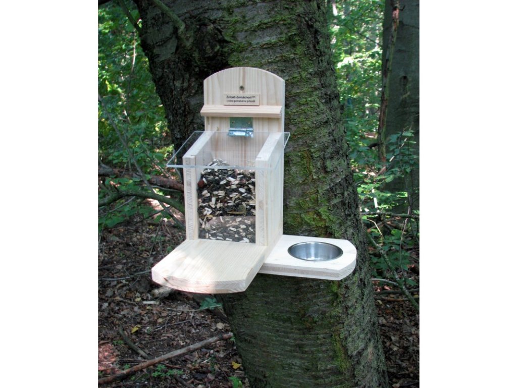 Otvírací stříška je konstruována tak, aby nemohla zůstat otevřená. Do krmítka tak nemůže napršet a má dostatečný přesah, aby šlo krmítko otevřít i odrostlejším mláďatům. Čelní průhledná stěna je odnímatelná a po jejím vyjmutí se krmítko snadno čistí. Vodorovné prkno před krmítkem je nyní prodlouženo pro větší pohodlí veverek.