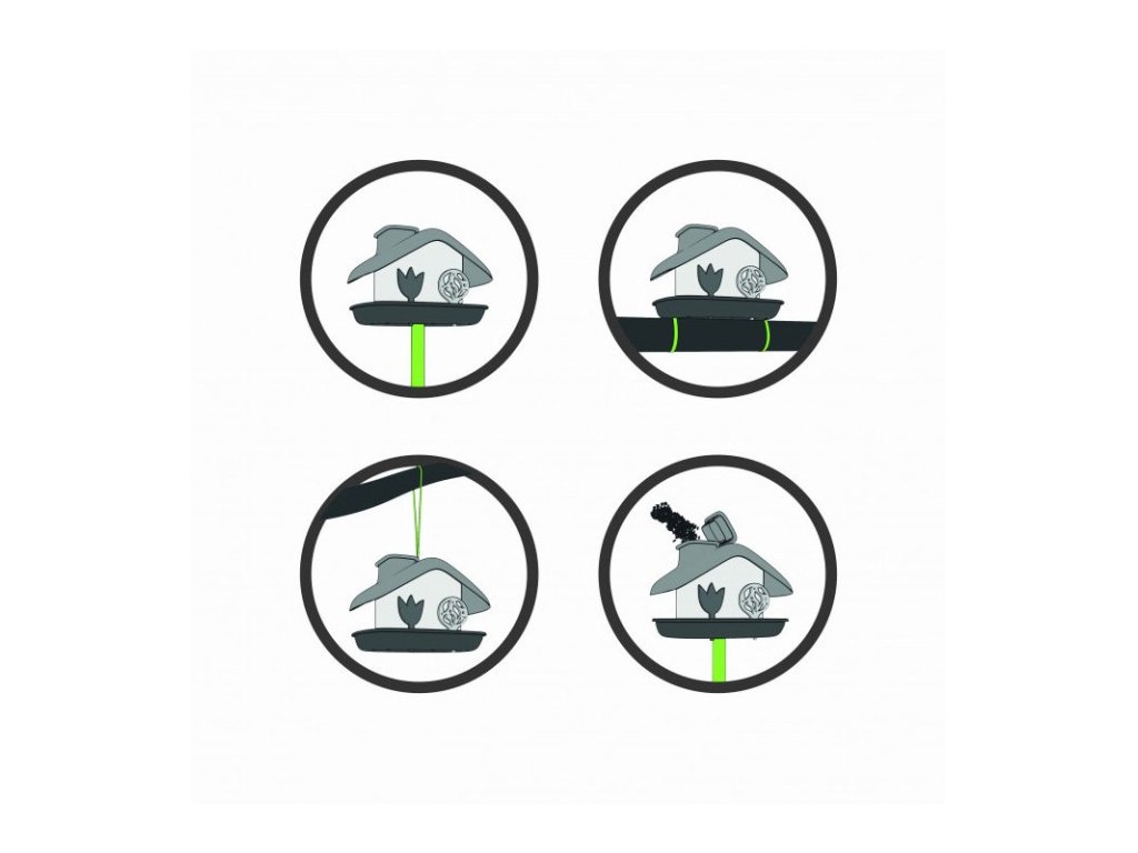 Největší předností tohoto krmítka je jeho variabilnost, co se týče umístění. Krmítko je navrženo tak, že ho můžete klasicky pověsit za provázek (součástí balení), ale lze ho tako pomocí plastových stahováků (součástí balení) připevnit na zábradlí balkonu či terasy (k vodorovné tyči). Třetí možností je zapíchnutí na kůl (vertikální tyč), krmítko má pro tuto možnost ve svém středu otvor. Díky tomu lze použít krmítko jak v zahradě, tak na balkoně či terase. Zapíchnutí na kůl na přehledném místě je vhodné v případě, že máte na pozemku kočky, které by chtěly ptáky ulovit. Krmítko by mělo být alespoň 1,5 metru nad zemí. Díky umístění na balkon můžete ptáky pozorovat i z pohodlí domova.