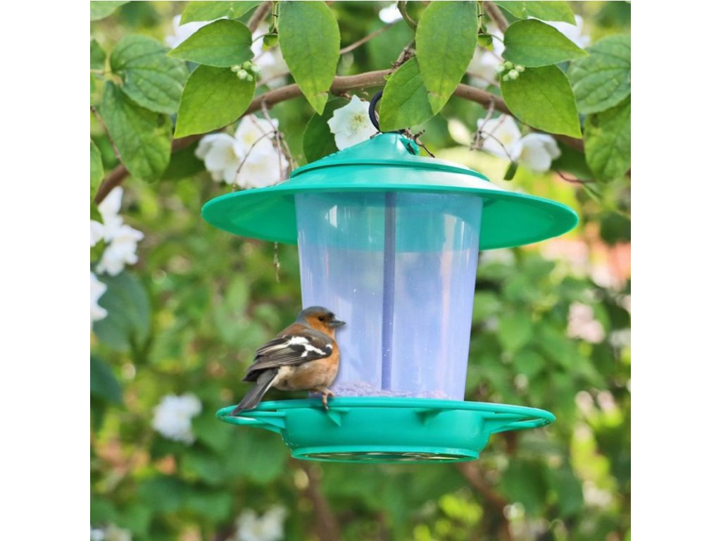 Praktické menší krmítko na semínka nebo oříšky je vyrobeno z recyklovaného plastu. Vejde se do něj cca 0,5 litru semínek. Semínka propadávají do spodní misky. Kolem misky je navíc bidýlko, na které mohou ptáci usednout, takže si nekálejí do krmiva. Krmítko se snadno pověsí za očko. Krmítko má otočnou horní část střechy. Otočením vznikne ve střeše otvor pro snadné doplnění semínek.