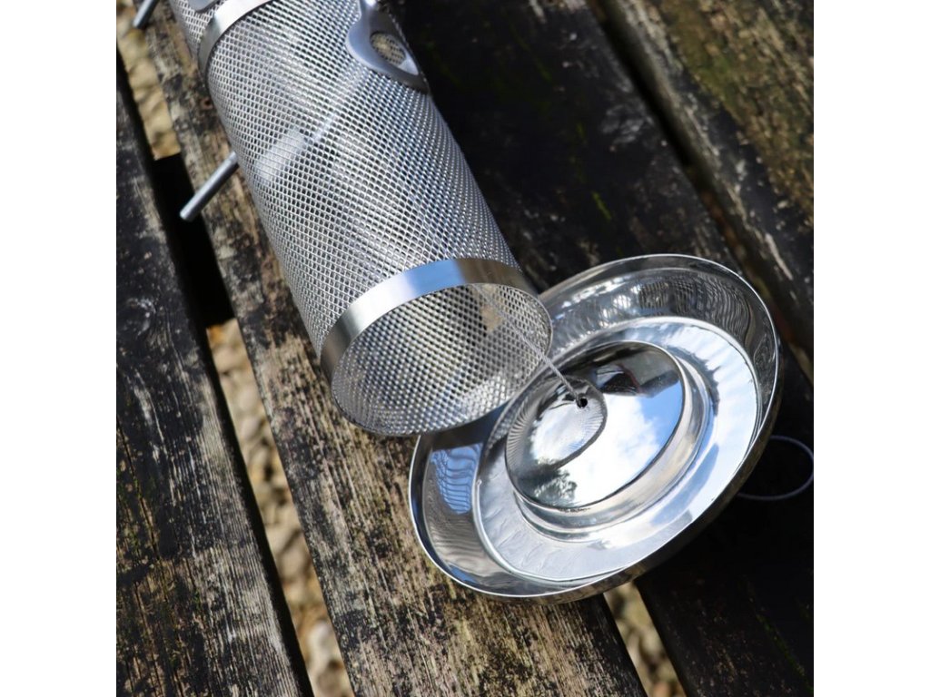 Celokovové krmítko na semínka je vyrobené z nerezové oceli, takže je odolné proti nepřízni počasí. Tvar krmítka chrání potravu před deštěm, ale i před exkrementy ptáků. Ptáci se mohou krmit z 8 otvorů, sednou si na bidýlko a vybírají semínka z otvoru, nebo si můžou zobnout ze spodní misky. Díky tomu, že ptáci v krmení nestojí, tak v něm ani nekálí, a zamezuje se tak přenos ptačích chorob skrz trus. I tak doporučujeme provádět komplexní hygienu krmítka cca jednou za 14 dní. Stačí dobře omýt mýdlovou vodou a nechat vysušit. Více o péči o krmítka se můžete dočíst na našem blogu zde.
