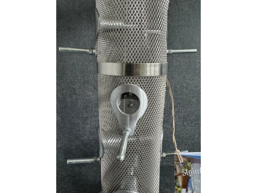 Krmítko se skládá ze spodní misky, válce s otvory a bidýlky a horní stříšky, vše je vyrobeno z nerezové oceli, krmítkem vede ocelové lanko, které drží všechny části pohromadě a za které se krmítko zavěsí na větev apod. Na rozdíl od kovových krmítek, které jsou jen potažené plastem, je toto krmítko vyrobeno čistě z nerezové oceli, a tudíž nerezaví. Neobsahuje žádné plastové součásti.