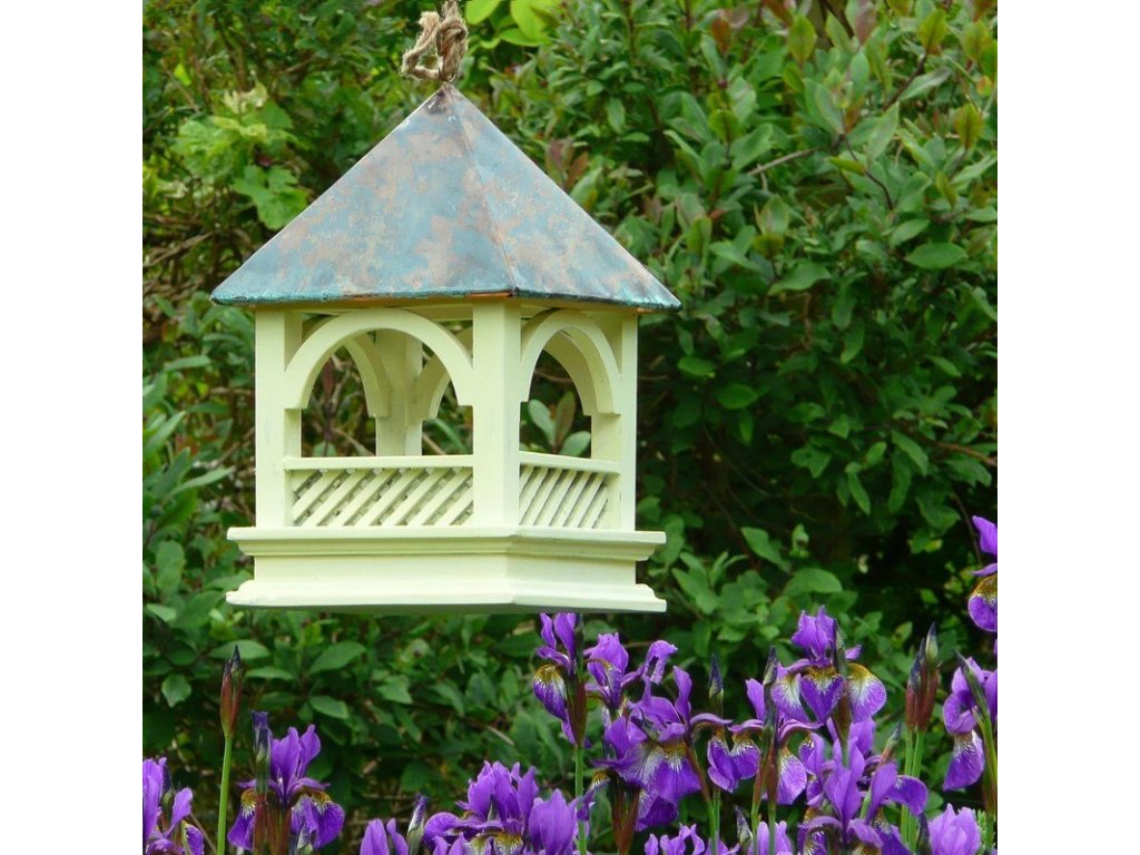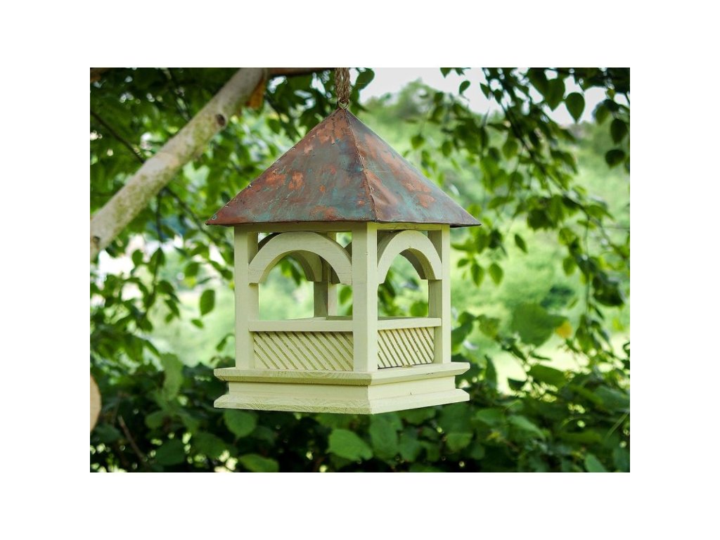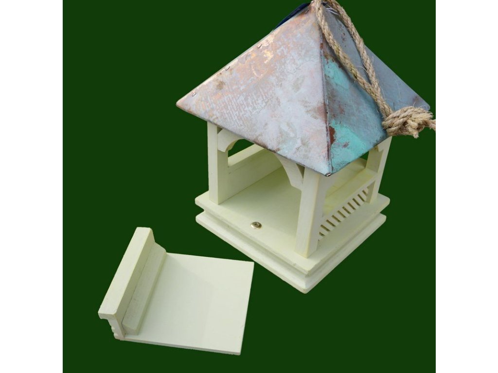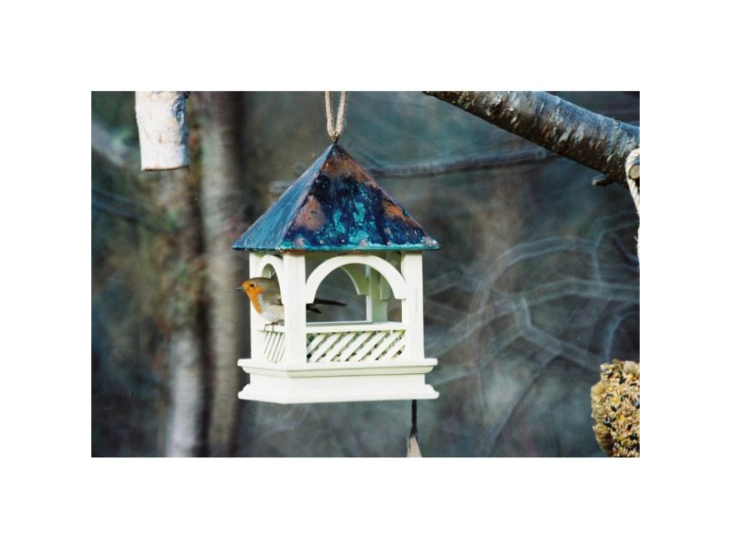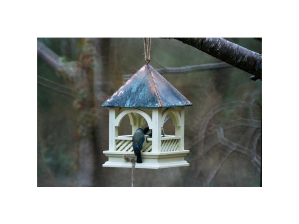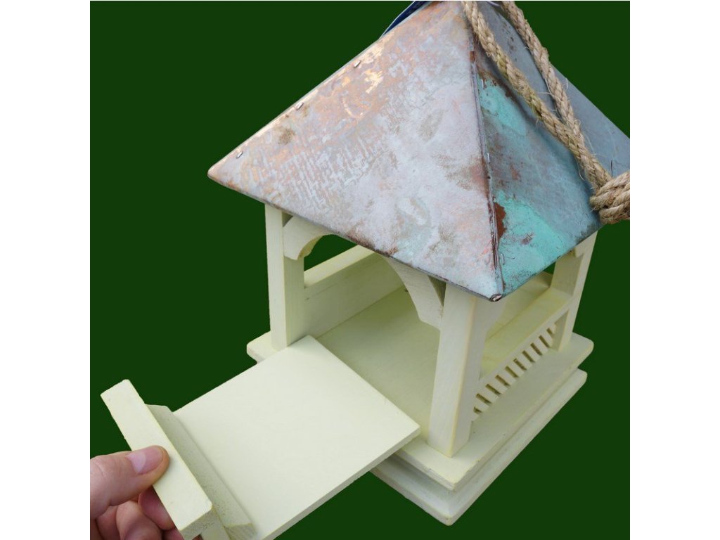Unikátní konstrukce krmítka je nejen krásná, ale zajišťuje také bezpečí ptáků při jídle. Zábradlí brání útokům koček na krmítko, zamezuje přístupu velkých ptáků dovnitř a díky oplechované střeše je potrava chráněna před větrem i deštěm. Dno je odnímatelné (vysouvací spolu s přední částí zábradlí), takže lze krmítko velmi snadno čistit. Čištění krmítek doporučujeme provádět cca jednou za 14 dní. Stačí dobře omýt mýdlovou vodou, nechat vysušit a díl poté vrátit.