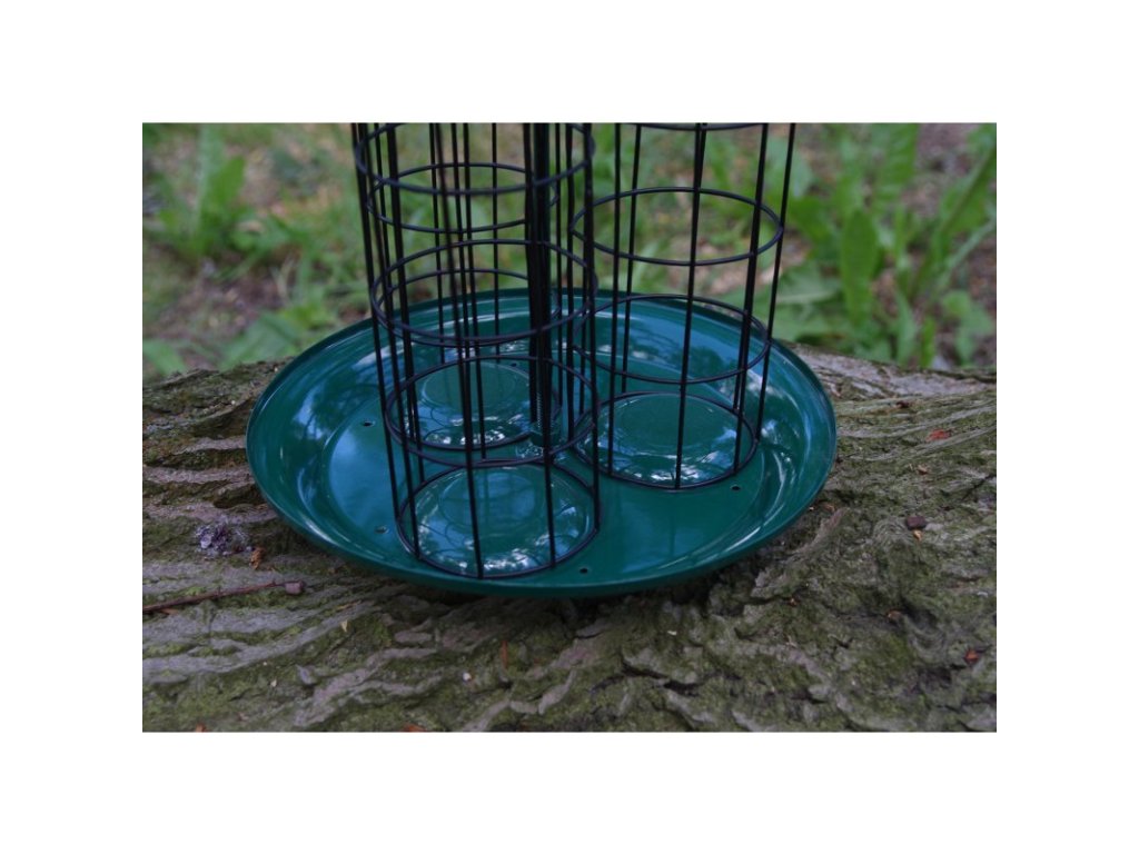 Spodní miska krmítka zachytává drobné kousky z lojových koulí a ty nepadají na zem. To ocení třeba páníčci, kteří nechtějí, aby jejich psi pravidelně „luxovali“ zbytky pod krmítkem.