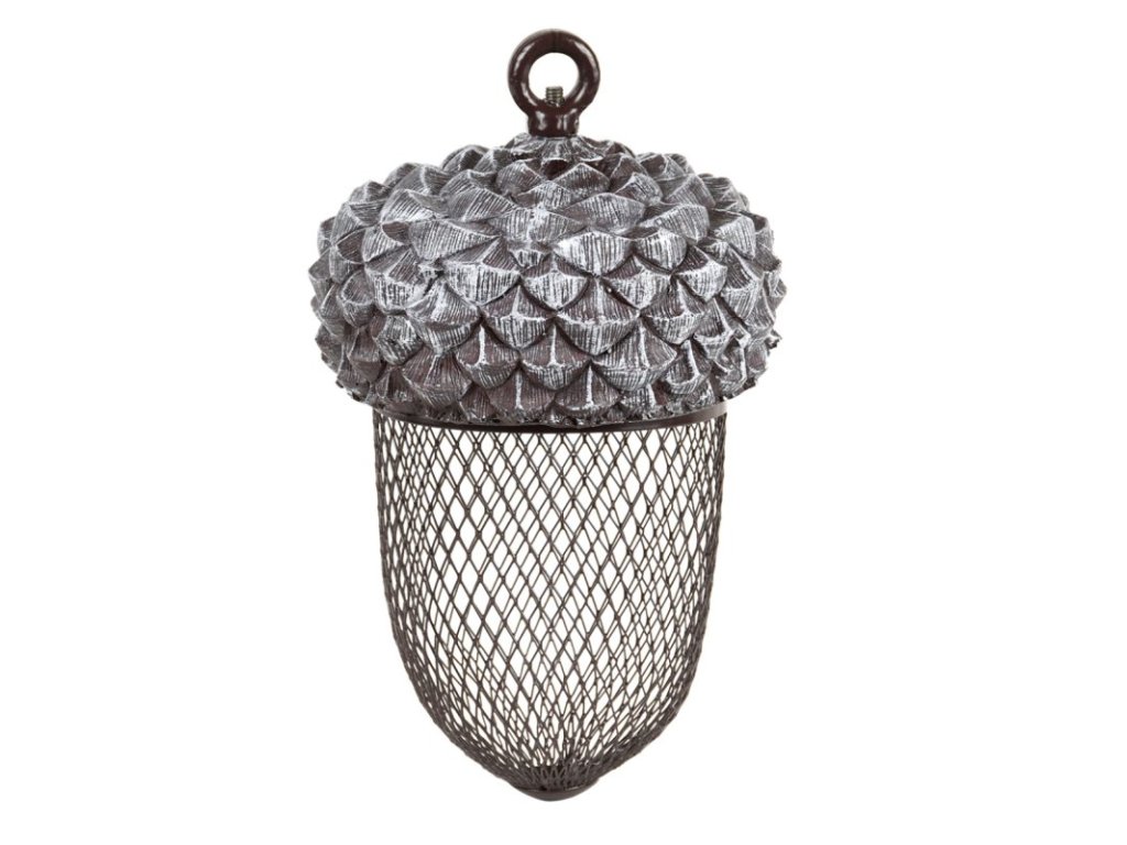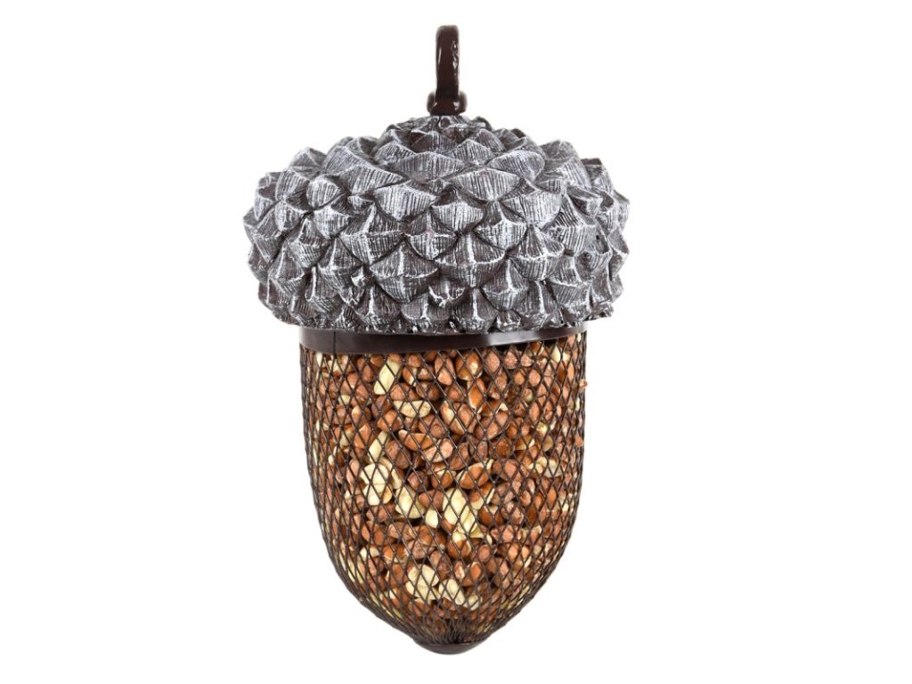 Toto krmítko je vhodné na oříšky (vlašské ořechy, celé arašídy…) nebo na lojové peletky, lze do něj ale vložit také lojové koule. Tělo krmítka je tvořené kovovou mřížkou, ptáci se na ni zavěsí a obsah krmítka si postupně vyzobávají. Neodnášejí si tedy celé oříšky mimo krmítko, ale musejí si je vyzobávat po kouskách skrz mřížku. Díky konstrukci nemůžou obsah krmítka odnést ani veverky. Odšroubováním závěsného očka lze krmítko rozebrat. Čepičku žaludu lze odšroubovat a krmítko naplnit, krmítko lze zavěsit pomocí očka na strom, tyč apod.