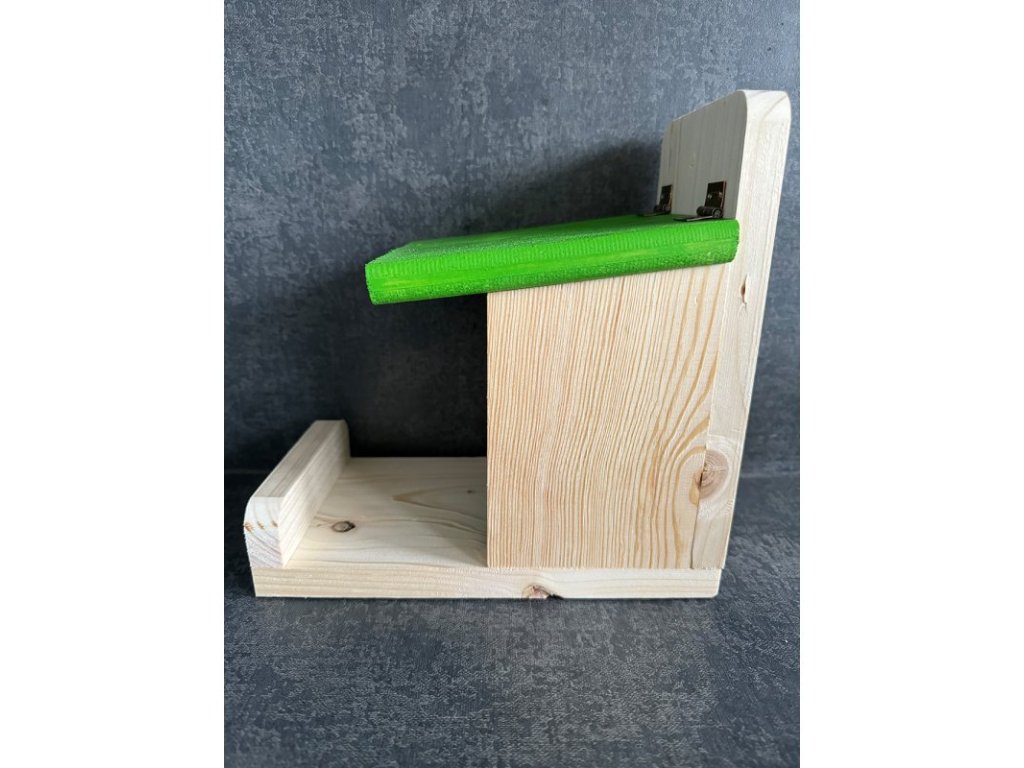 - Krmítko není, z ekologických důvodů, kromě střechy nijak ošetřeno. Případný nátěr ekologickou, vodou ředitelnou barvou je však možný a prodlouží životnost krmítka.