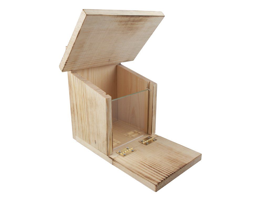 Krmítko je vyrobeno z přírodního, neošetřeného dřeva. Praktické skleněné okénko umožňuje snadno kontrolovat množství krmiva uvnitř.