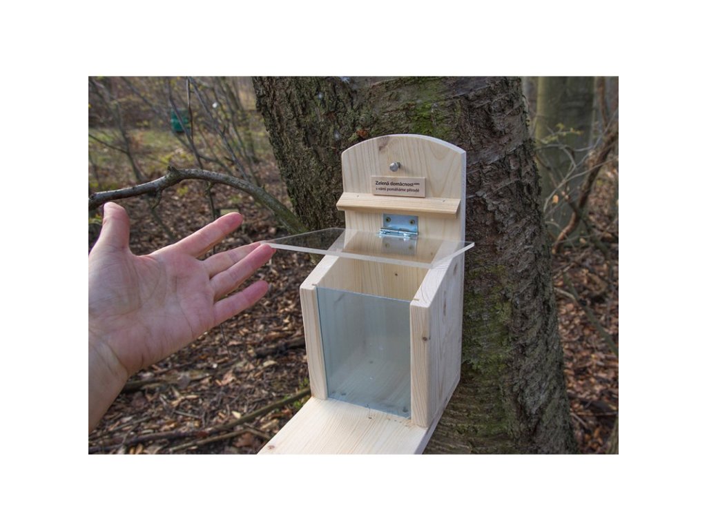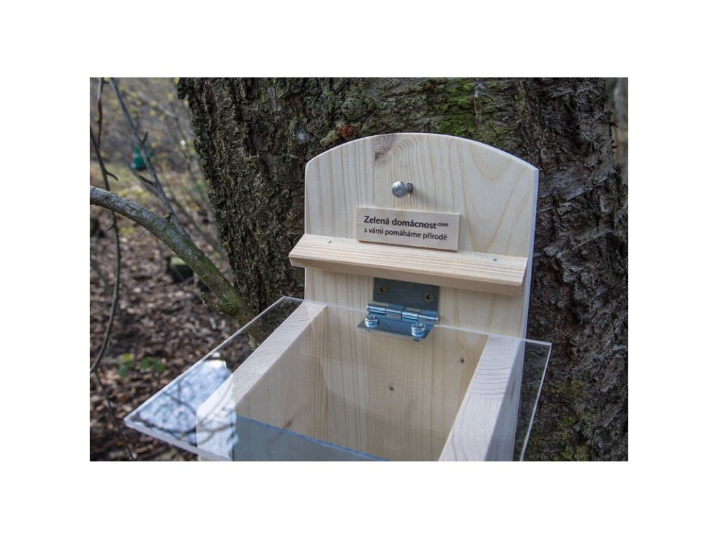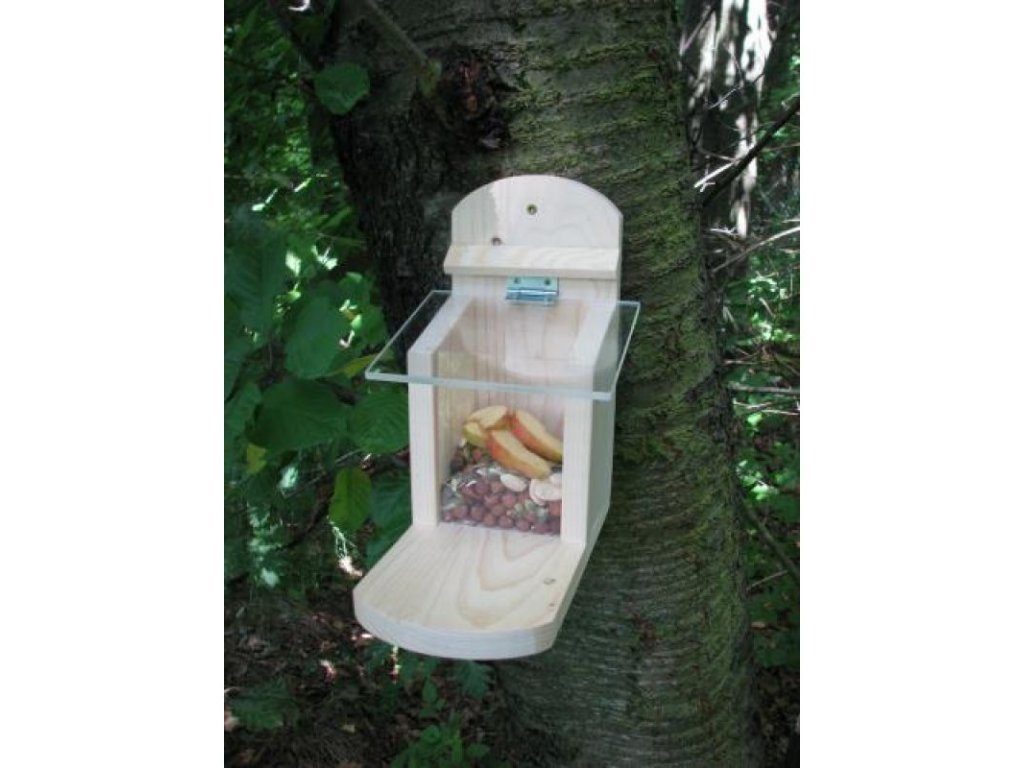 Otvírací stříška je konstruována tak, aby nemohla zůstat otevřená. Do krmítka tak nemůže napršet a stříška má dostatečný přesah, aby šlo krmítko otevřít i odrostlejším mláďatům. Čelní průhledná stěna je odnímatelná a po jejím vyjmutí se krmítko snadno čistí. Vodorovné prkno před krmítkem je nyní prodlouženo pro větší pohodlí veverek.
