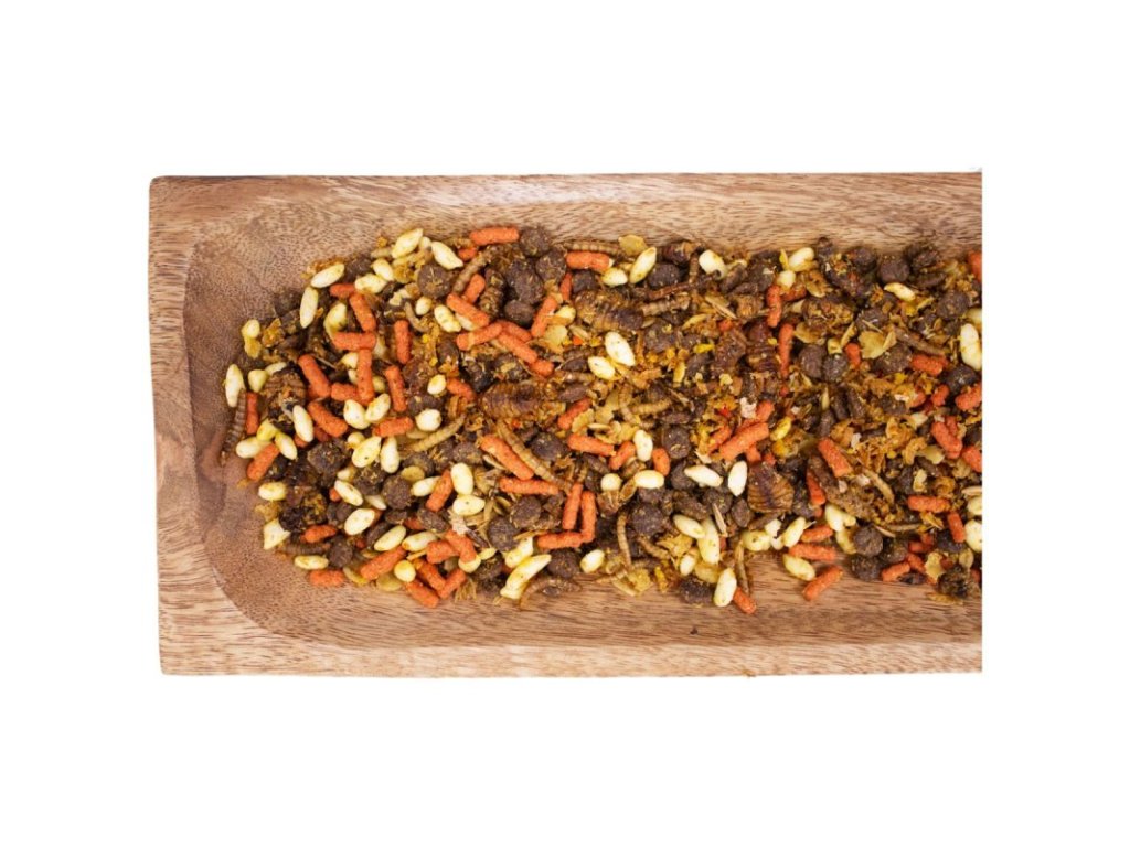 - Složení: extrudovaná pšeničná mouka, krevety 15 %, řepkový olej, lupinové vločky, drůbeží protein 9,5 %, ovesné vločky, extrudovaná kukuřičná mouka, kokony bource morušového 5 %, pufovaná rýže, vaječný prášek, mouční červi 3 %, mrkev, hovězí tuk, drůbeží tuk, hovězí a vepřová moučka, sója