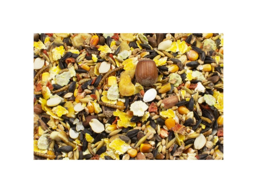 - Složení: loupaná slunečnicová semínka, kukuřičné vločky, oves, kukuřice, pšenice, hrachové vločky, pšeničné vločky, karob, banán, loupaná dýňová semínka, arašídy, mrkev, pine nuts, vlašský ořech, proso seté, mouční červi 2%, pohanka, kokosový olej, crude, lískový ořech 0.5%, řepkový olej