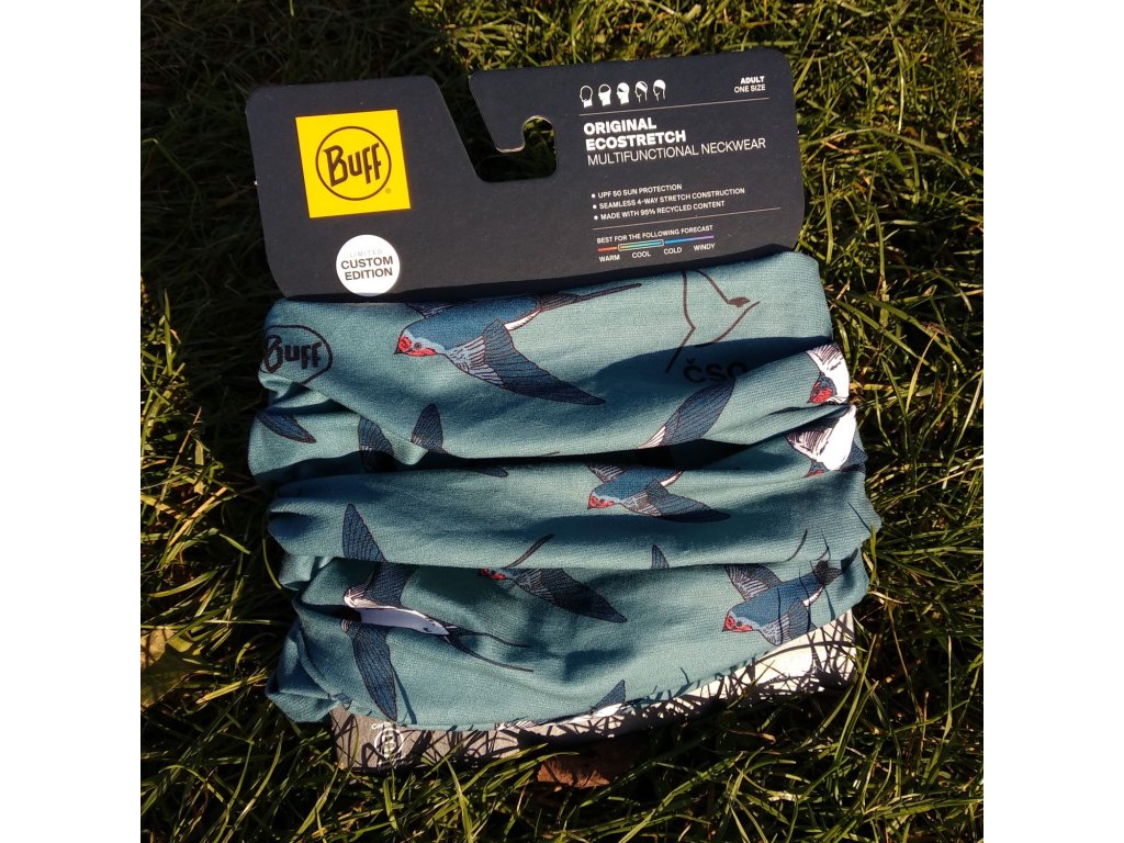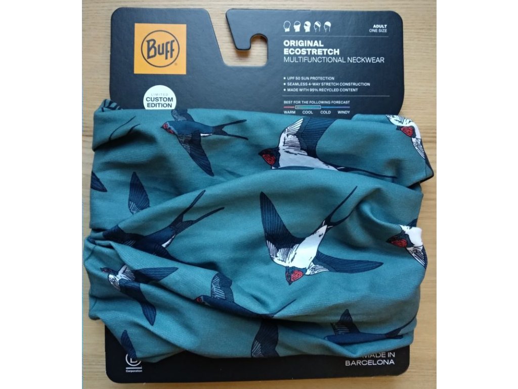 Multifunkční nákrčník značky Buff, který můžete nosit jako šátek, čelenku, potítko, kuklu či čepici. V limitované edici s originálním motivem vlaštovek, vyroben speciálně pro partnerské organizace BirdLife ve spolupráci s BirdLife Cyprus.