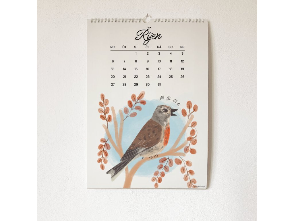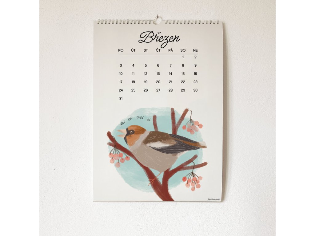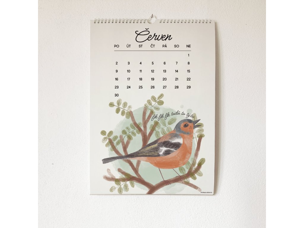 Každá stránka patří jednomu měsíci, každý měsíc patří jednomu ptáčku. V kalendáři je 12 ptačích ilustrací doplněné o zpěvy, jak je zapsal písmenky jeden hudebník.