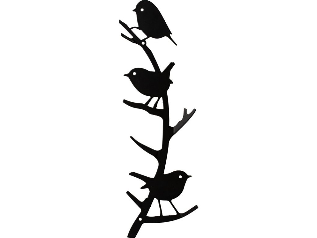 - Věšák je zdoben siluetami tří malých ptáků: červenky, sýkory modřinky a střízlíka, což dodává interiéru přírodní a estetický prvek