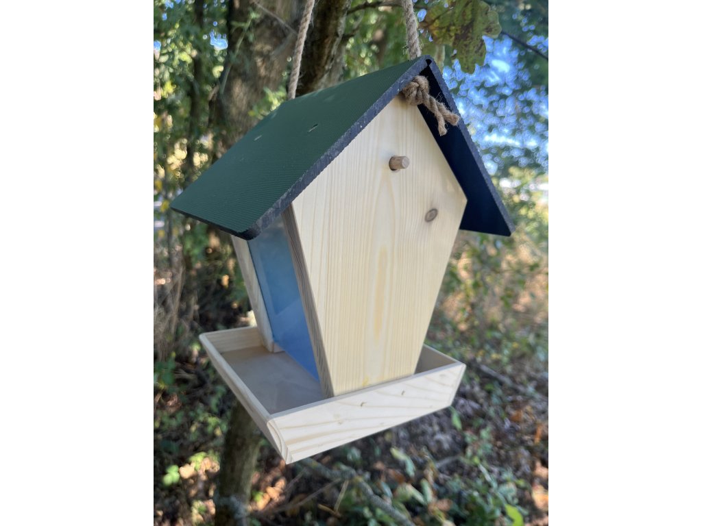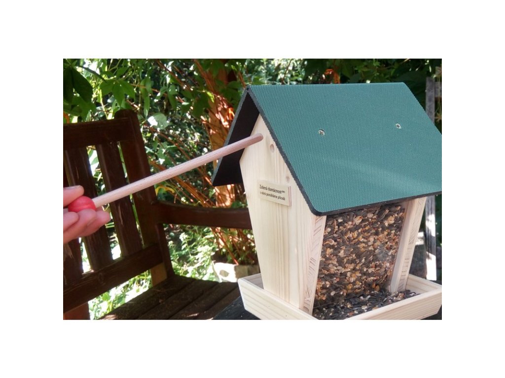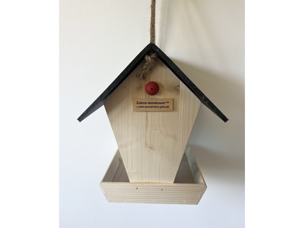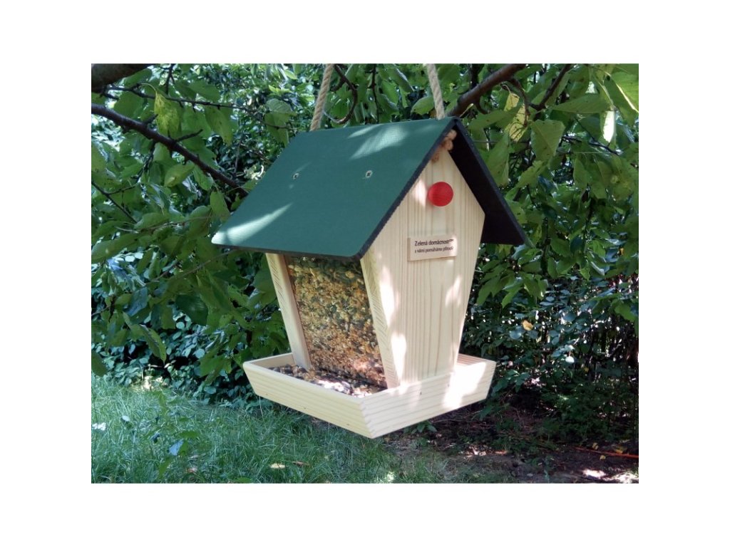 Toto atraktivní krmítko kombinuje oblíbený vzhled krmítka domečku s ochranou semínek nejen před deštěm a sněhem, ale i před trusem ptáků. Krmítko jsme navrhli a nechali vyrobit v České republice. Tělo krmítka je vyrobené z masivních dřevěných desek, zásobník je díky plexi skle průhledný, střecha je chráněná před deštěm deskou z recyklovaného plastu. Jde o unikátní výrobek, který nikde jinde nenajdete. Stejné krmítko prodáváme také ve variantě k postavení, to nemá závěsný systém, ale má navíc nožičky.