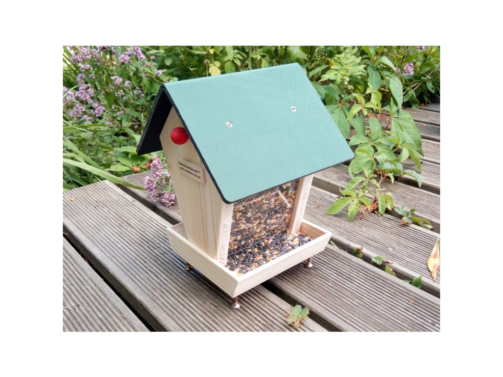 Toto atraktivní krmítko kombinuje oblíbený vzhled krmítka jako domku s ochranou semínek nejen před deštěm a sněhem, ale i před trusem ptáků. Krmítko jsme navrhli a nechali vyrobit v České republice. Tělo krmítka je vyrobené z masivních dřevěných desek, zásobník je díky plexi skle průhledný, střecha je chráněná před deštěm deskou z recyklovaného plastu. Jde o unikátní výrobek, který nikde jinde nenajdete. Stejné krmítko prodáváme také ve variantě k zavěšení, to má provaz a nemá nožičky.