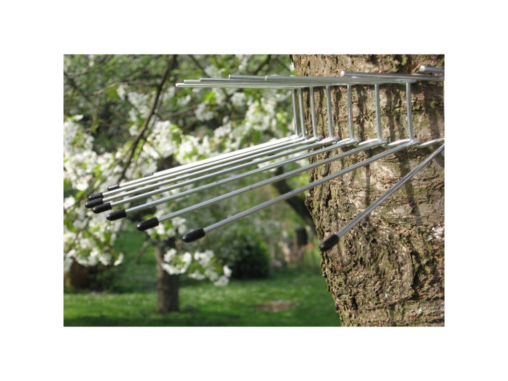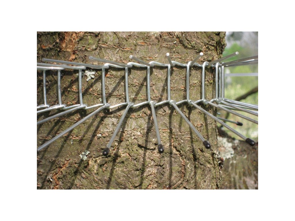 Instalace: Vždy instalujte do takové výšky (cca 2,5 metru od země), aby nemohlo dojít k poranění dětí ani dospělých. Zabezpečení funguje jen v případě, pokud kočka nebo jiný predátor nemůže přeskočit z blízkého sousedního stromu přímo nad ochranu. Při instalaci je důležité, aby delší drátěné kolíky směřovaly dolů a byly nakloněny (nasaďte plastové ochranné krytky). Kratší drátěné kolíky jdou vodorovně nebo nahoru.