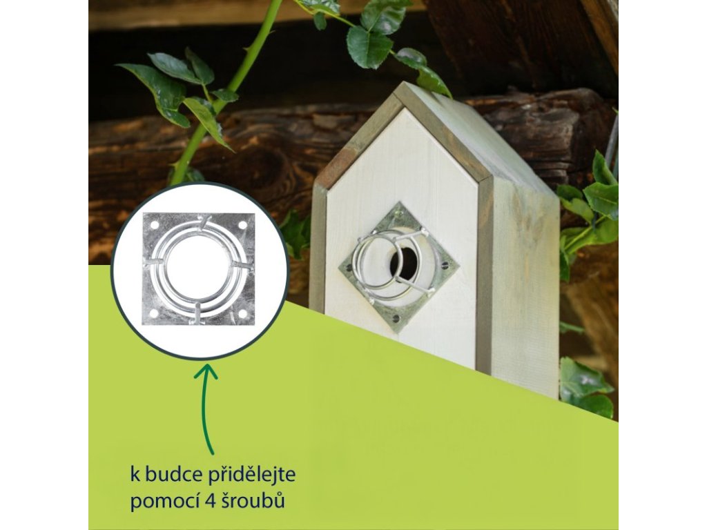- Ochranný rám se jednoduše připevní před vletový otvor budky pomocí čtyř šroubů