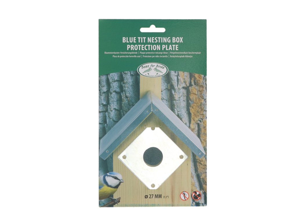 Strakapoudi i veverky někdy obsadí ptačí budku jiných ptáků. Klovají nebo okusují dřevo kolem vchodu a tím ho zvětší, aby se pohodlně dostali dovnitř. Kovová deska od nizozemské značky Esschert Design ho chrání před poškozením a prodlužuje tím celkovou životnost budky.