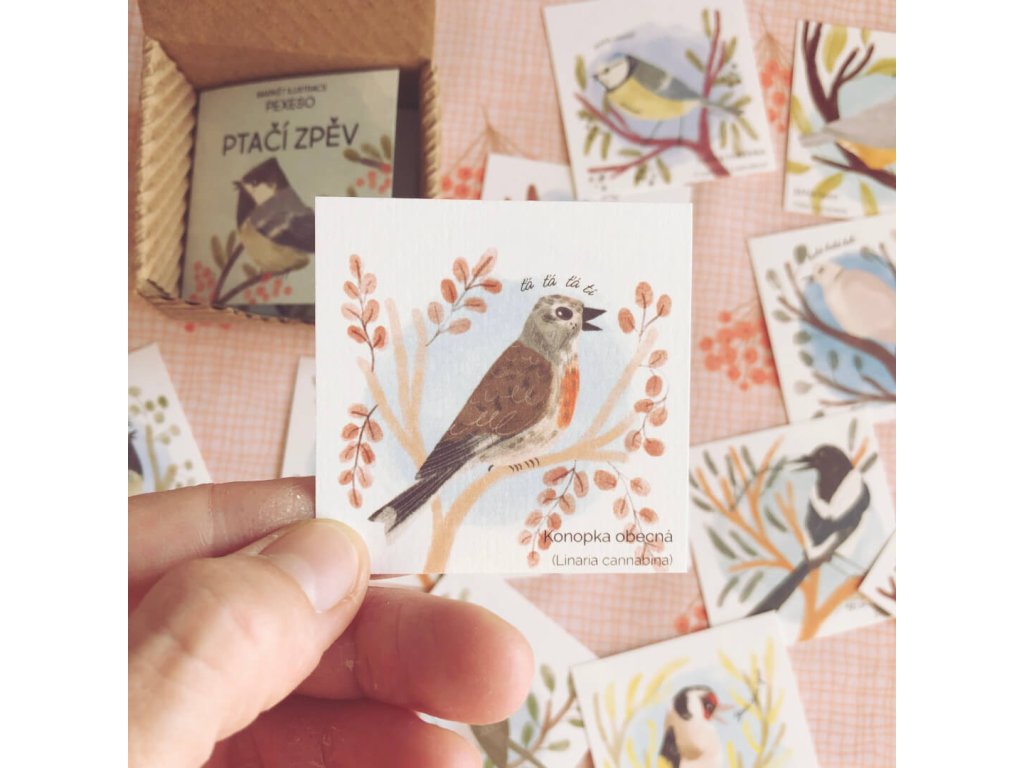 Pexeso je už nařezané a přijde k vám v kartonové krabičce. Ta obsahuje 32 + 32 kartiček s druhy ptáčků s českým a latinským názvem.
