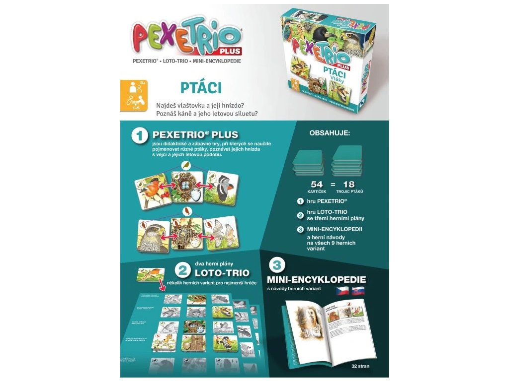 Pexetrio PTÁCI je zábavná hra inspirovaná pexesem, která děti zároveň i vzdělává. Děti se naučí poznávat různé ptáky, jejich hnízda s vejci a jejich letovou podobu podle hesla „škola hrou“. Kromě toho, že si děti osvojí ptáky zábavným způsobem, hra také napomáhá rozvíjet jejich logické myšlení a trénovat paměť hledáním trojice kartiček s různými ptáky, jejich hnízdy s vejci a jejich letovou podobou.