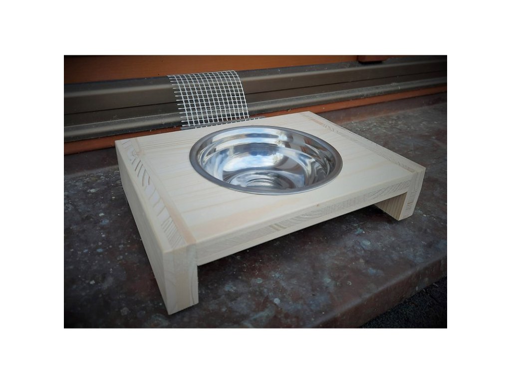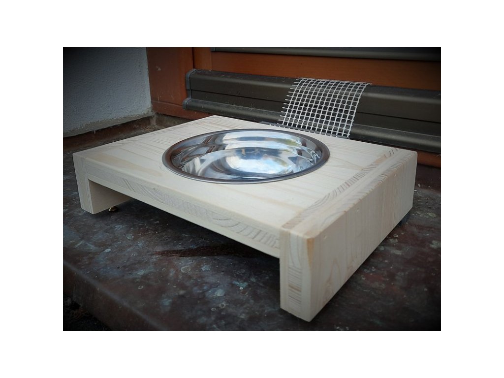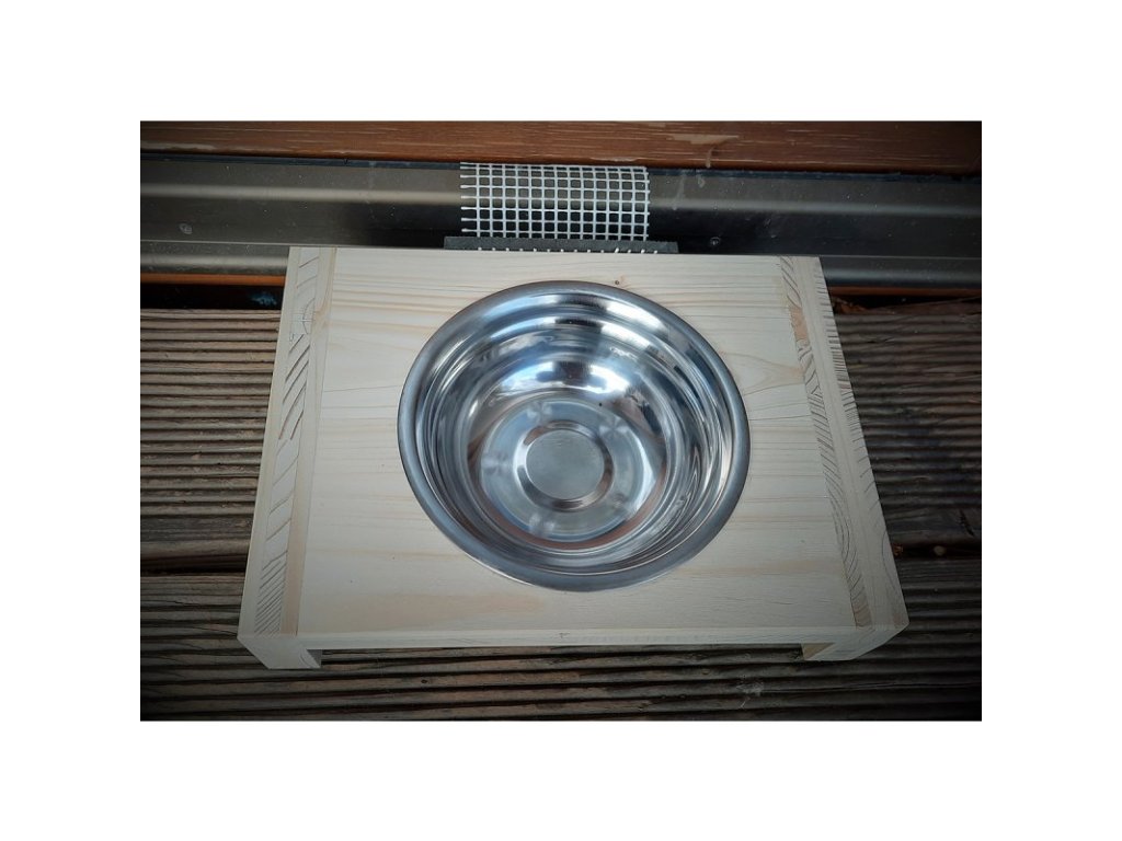 - Dřevěné pítko/krmítko s odnímatelnou kovou miskou o objemu cca 220 ml