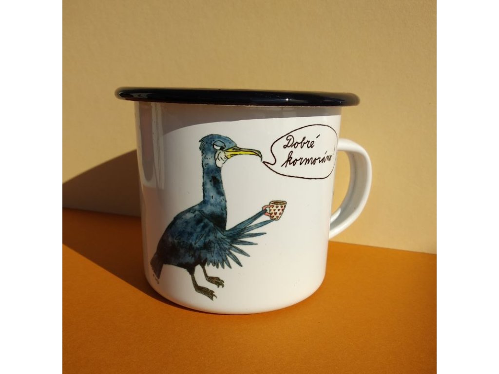 Bílý plechový hrneček s černým lemem s motivem kormorána. Autorkou návrhu je Anna Vosolsobě.