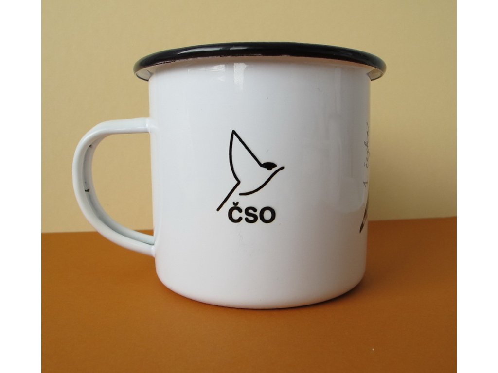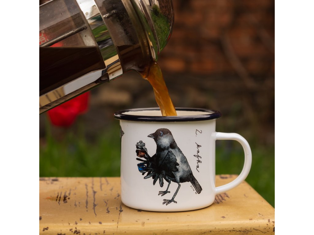 Bílý plechový hrneček s černým lemem s motivem kavky. Autorkou návrhu je Anna Vosolsobě. www.annavosolsobe.cz