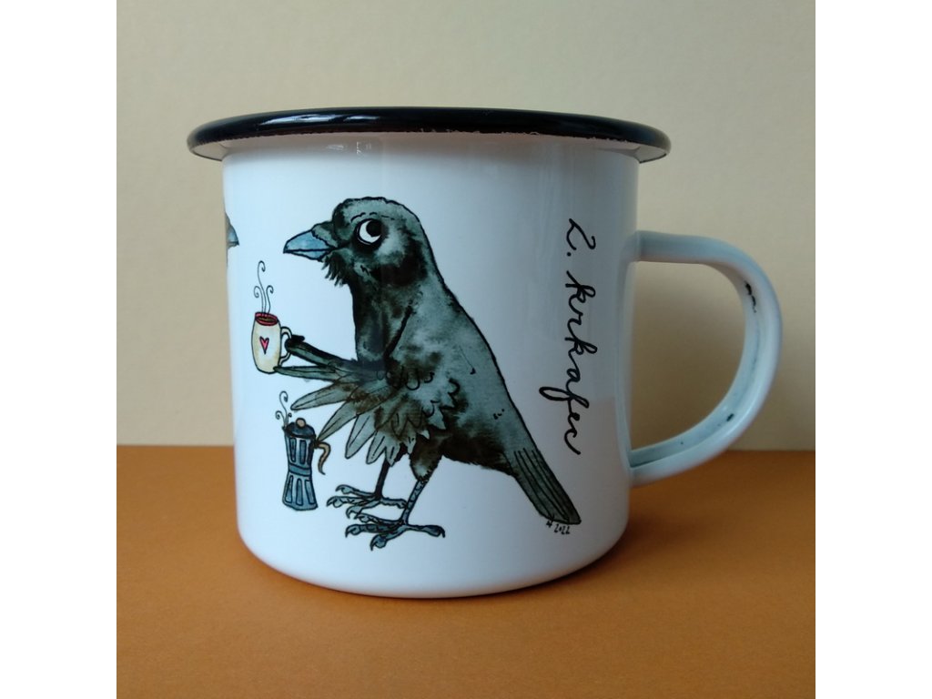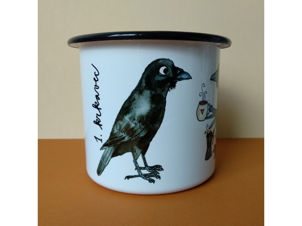Bílý plechový hrneček s černým lemem s motivem krkavce. Autorkou návrhu je Anna Vosolsobě.