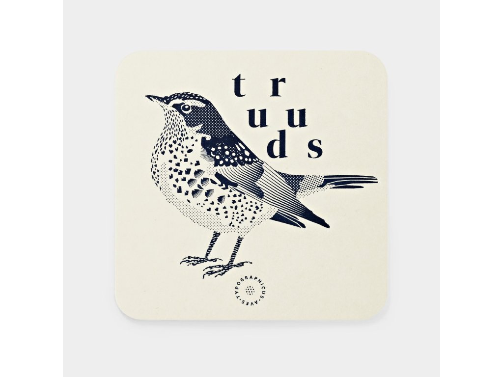 Podtácek s motivem kvíčaly vyražený manufakturním knihtiskem.