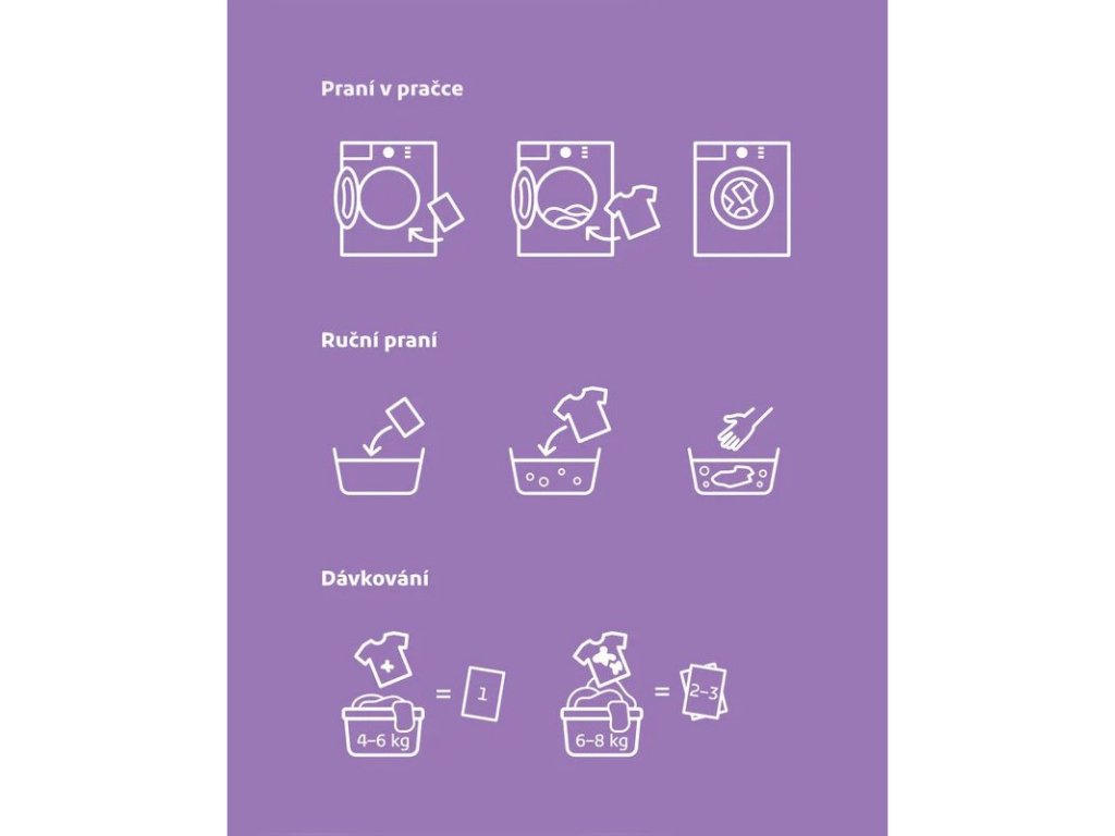 Použití: Papírek nabízí to nejjednodušší dávkování a používání. Při menším množství prádla stačí roztrhnout napůl, při větším kousek přidat. Papírek vložte do bubnu pračky, teprve potom vložte prádlo. Tak zaručíte, že se papírek během několika vteřin zcela rozpustí a dokonale vypere vaše prádlo. Hodí se pro ruční praní a pračky vrchem i předem plněné.