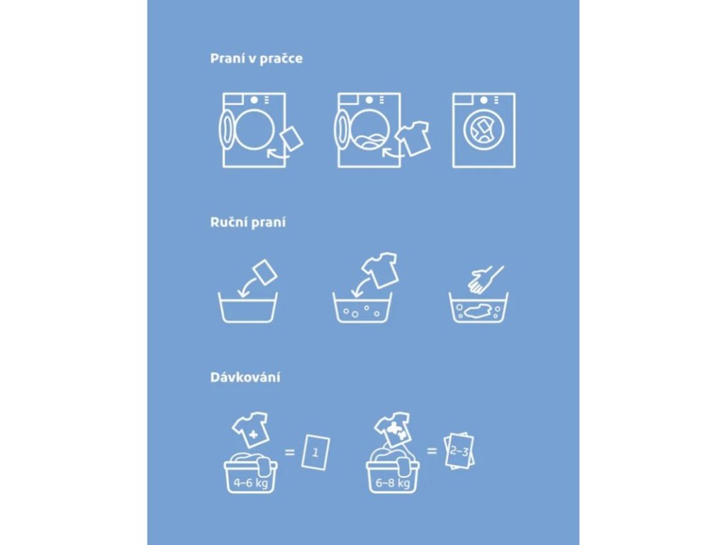 Použití: Papírek nabízí to nejjednodušší dávkování a používání. Při menším množství prádla stačí roztrhnout napůl, při větším kousek přidat. Papírek vložte do bubnu pračky, teprve potom vložte prádlo. Tak zaručíte, že se papírek během několika vteřin zcela rozpustí a dokonale vypere vaše prádlo. Hodí se pro ruční praní a pračky vrchem i předem plněné.