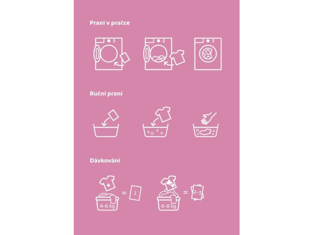 Použití: Papírek nabízí to nejjednodušší dávkování a používání. Při menším množství prádla stačí roztrhnout napůl, při větším kousek přidat. Papírek vložte do bubnu pračky, teprve potom vložte prádlo. Tak zaručíte, že se papírek během několika vteřin zcela rozpustí a dokonale vypere vaše prádlo. Hodí se pro ruční praní a pračky vrchem i předem plněné.