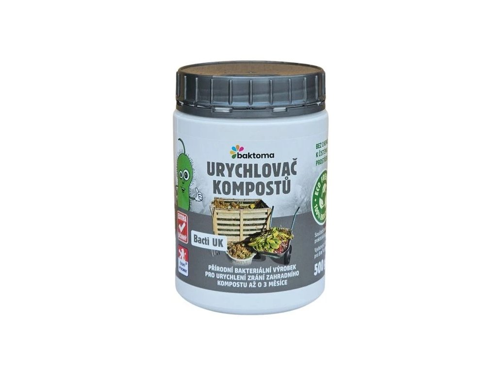 Urychlovač kompostů Bacti UK značky Bactoma představuje způsob, jak efektivně a ekologicky zpracovat organický odpad a obohatit svou zahradu kvalitním kompostem, navíc ve zkráceném čase. Speciálně vybrané bakterie a enzymy nastartují a podpoří přirozené rozkladné procesy už za několik dní.