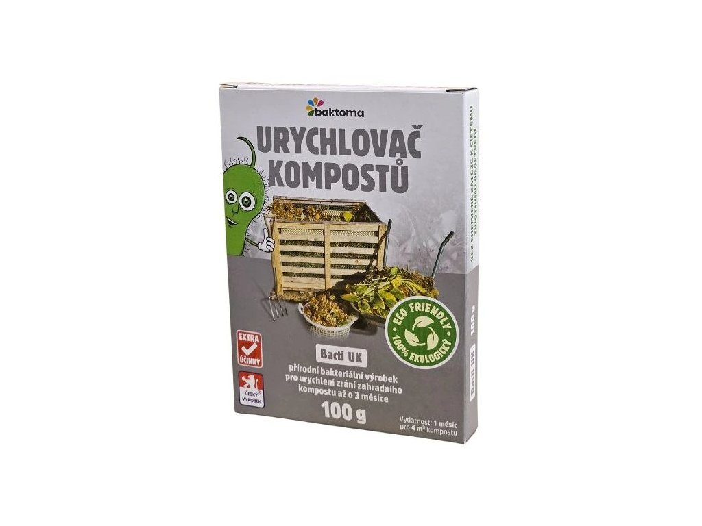 Urychlovač kompostů Bacti UK značky Bactoma představuje ekologický a efektivní způsob, jak zpracovat organický odpad. Svou zahradu díky němu obohatíte kvalitním kompostem, navíc ve zkráceném čase. Speciálně vybrané bakterie a enzymy nastartují a podpoří přirozené rozkladné procesy už za několik dní.