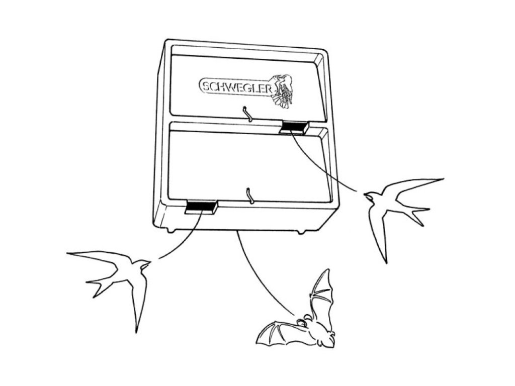 - Tato budka je kombinace budky pro rorýsy a netopýry. Je rozdělena na dvě části s vlastními vchody, takže jak rorýsi, tak netopýři zde mohou spokojeně hnízdit a rozmnožovat se. Navíc ještě speciálně tvarovaná zadní stěna poskytuje další štěrbinu pro úkryt netopýrů.
