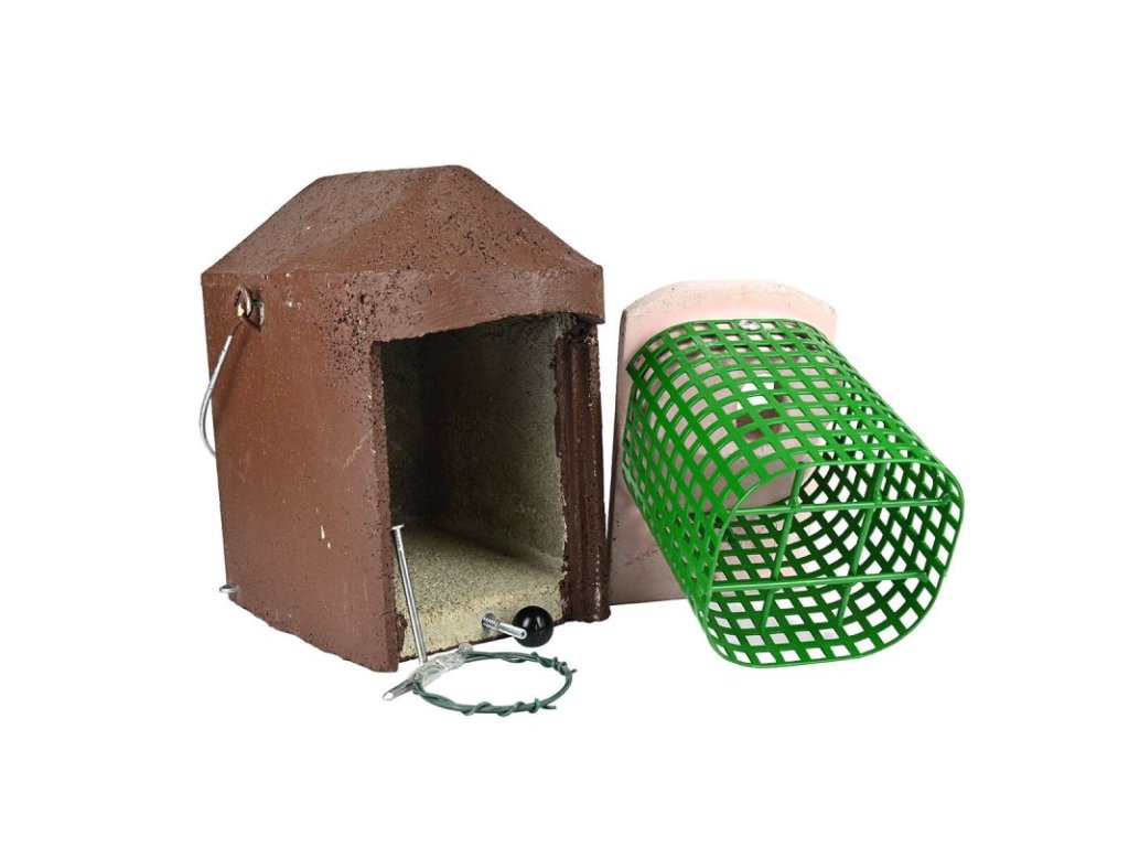 - Obsah balení: tělo budky typu 2GR, přední panel s integrovanou ochranou, uzavírací kulička, ocelové zavěšení na strom nebo na větev a speciální hliníkový hřebík