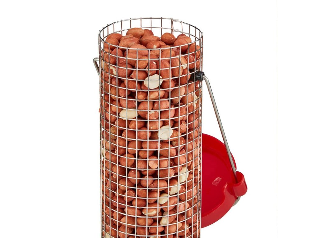 Do krmítka se vejde cca 0,5 litru potravy, vhodné jsou lojové peletky, celé arašídy nebo různé loupané oříšky.