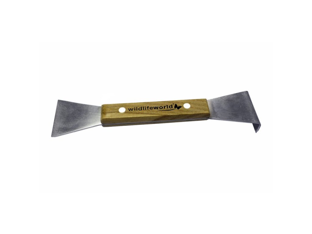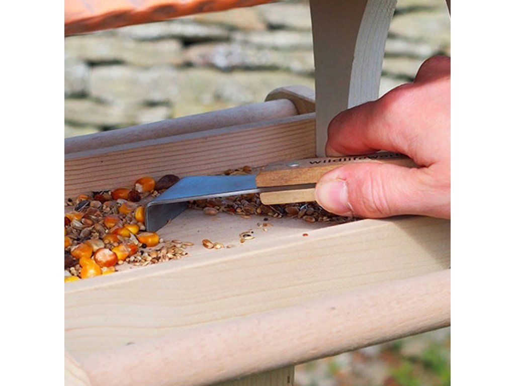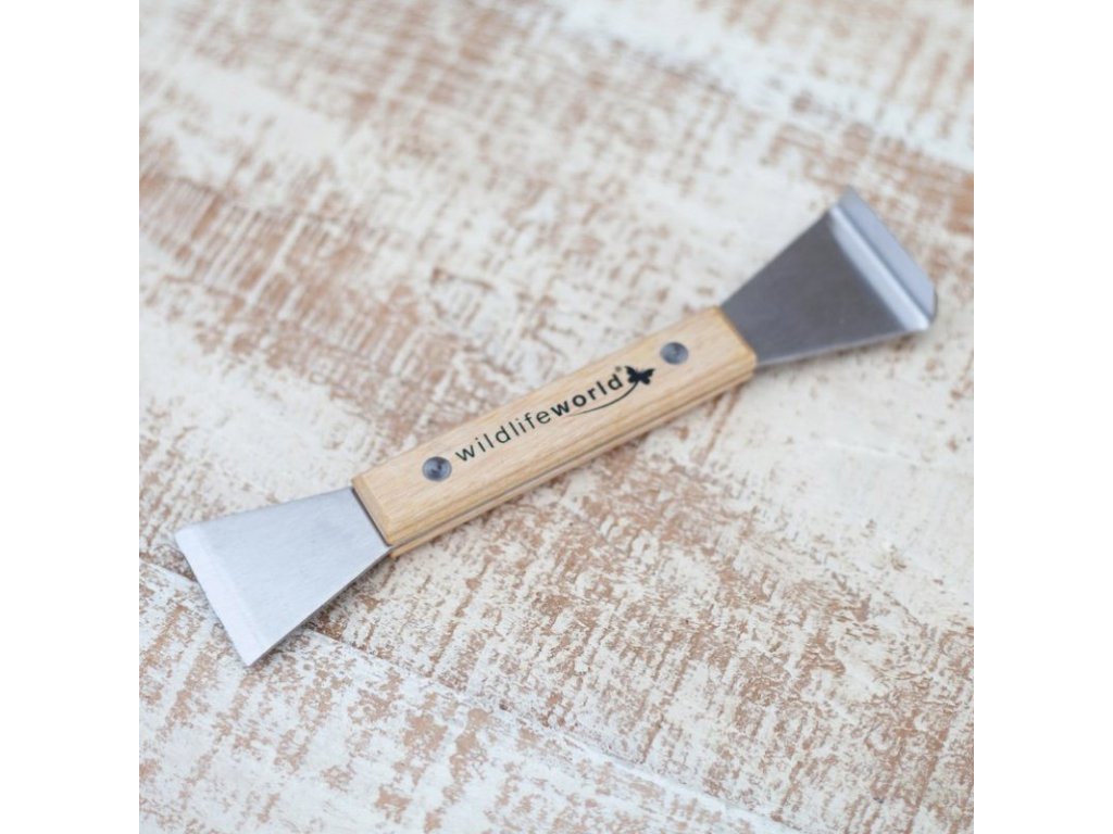 Oboustranný nástroj na čištění ptačích budek, krmítek, ale i čehokoliv jiného. Na jedné straně je rovná škrabka, na druhé straně zahnutá. Nástroj je vyrobený z nerezové oceli a tvrdého dřeva, je velmi odolný a trvanlivý. Dobře se s ním odstraňují různé zaschlé zbytky jídla nebo výkaly.